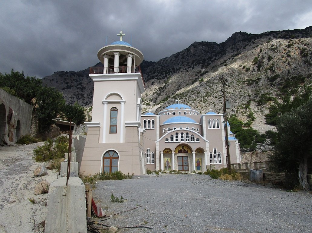 Oorspronkelijk was het klooster een soort dependance van het nabijgelegen Varsamonero klooster en het werd uiteindelijk verlaten. Nu is het grootste gedeelte van het Agios Nikolaos klooster een moderne aangelegenheid. Het is heel groot en de verf was in 2017 nog niet opgedroogd. Er waren ook nog stukken die nog niet af waren gebouwd, dus het klooster wordt nog groter. Het klooster van Agios Nikolaos heeft een grote en een aantal kleinere blauwe koepels en hij is versierd met mooie mozaieken. De klokkentoren staat los en is voorzien van een aantal klokken en een lichtblauwe koepel die op pilaren staat.