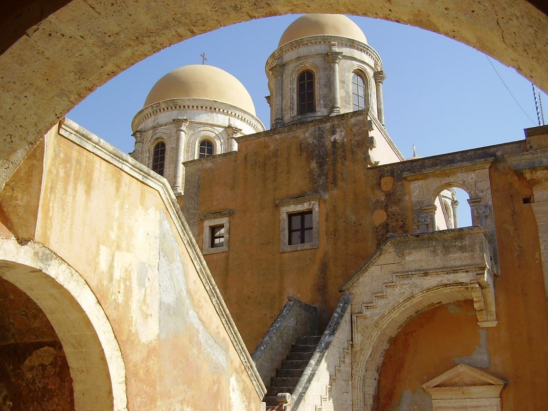 Het Agia Triada klooster ligt in het noordwesten van het schiereiland Akrotiri, aan de oostzijde van de stad Chania. De stad Chania ligt op 16 kilometer afstand. Het Agia Triada klooster werd gebouwd in de zeventiende eeuw (1612) door twee Venetiaanse monniken, de twee broers Jeremia en Lavrentio Jagarolon, die afstamden van een belangrijke Venetiaanse Kretenzer familie. Het klooster werd gebouwd bovenop de restanten van een reeds bestaande kerk, die in verval was geraakt. De eerste broer, Jeremia, begon het werk in 1611 en na zijn dood in 1634 werd het voortgezet door Laurentios. In 1645 werden alle werkzaamheden aan het klooster gestopt toen het gebied werd veroverd door de Turken. In 1821 werd het gebouw verbrand door de Turken tijdens de Griekse revolutie. Later werd het klooster gerenoveerd en eindelijk afgebouwd.