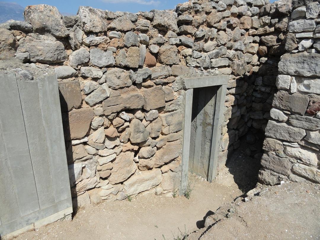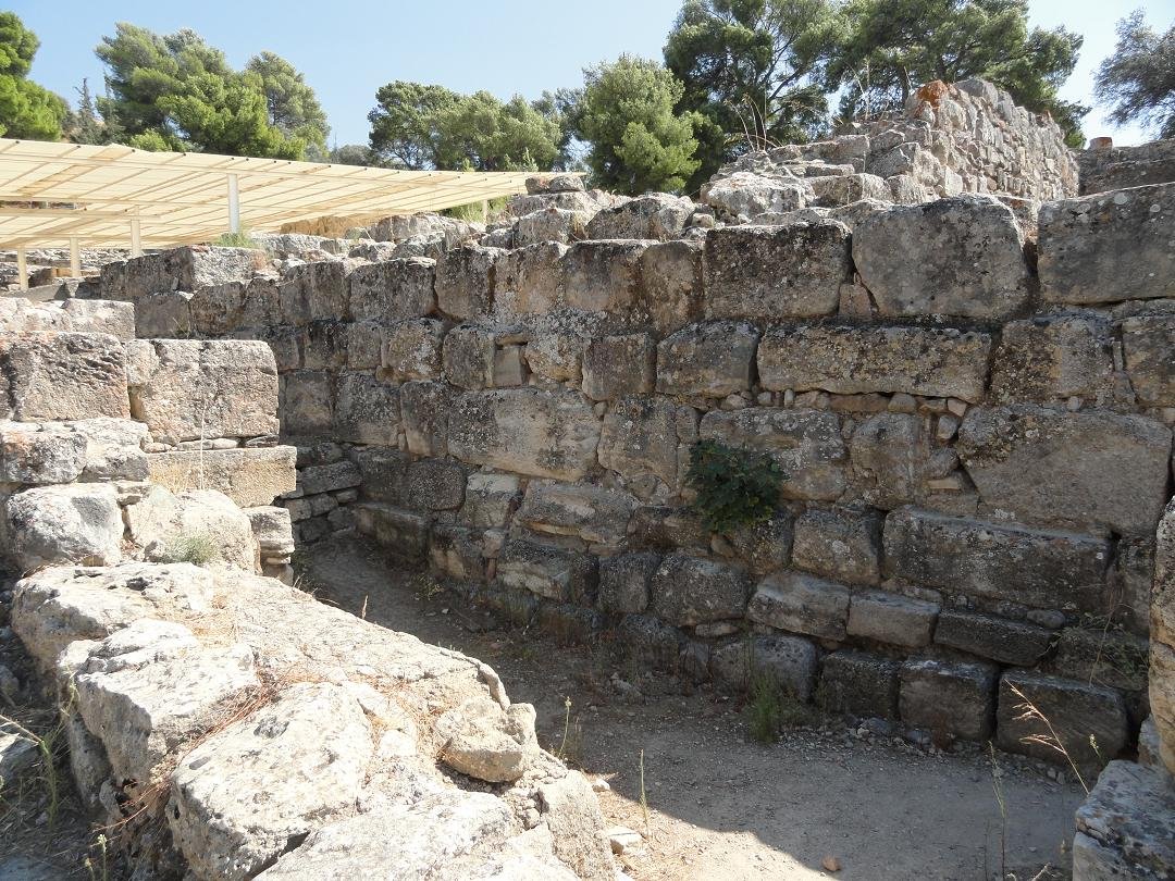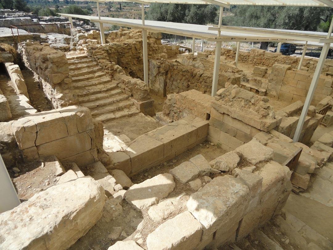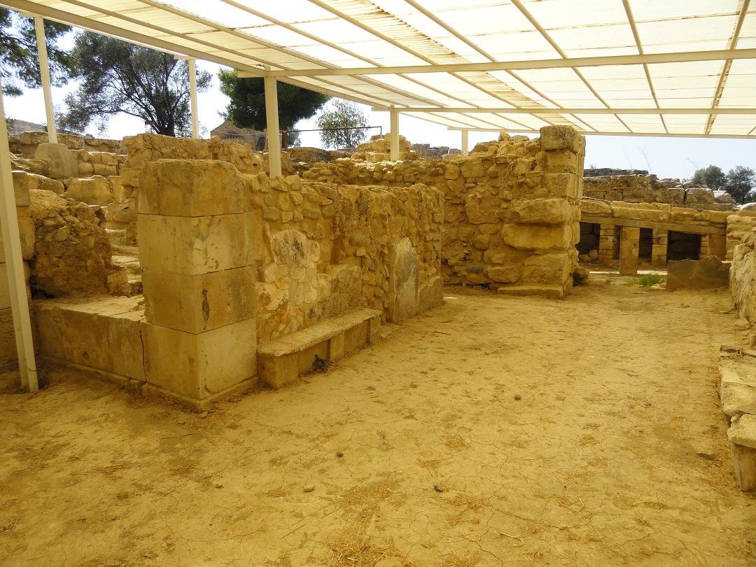 De Agia Triada is een grote Mino�sche opgraving in het zuiden van Kreta, die vlakbij Timpaki ligt. Het is door de Italiaanse archeologen die het opgegraven hebben, vernoemd naar een een nabijgelegen verlaten middeleeuws stadje dat door de Turken verwoest werd. Als je vanaf Timpaki naar het oosten rijdt richting Mires, krijg je aan de rechterkant eerst de afslag naar Kalamaki Beach en vlak daarna zie je het bruine bordje voor de afslag naar de Agia Triada. De laatste paar honderd meter naar deze Mino�sche opgraving gaan over een onverharde weg. Dat was al zo toen ik er in 1975 voor het eerst kwam kijken, en toen ik er in 2011 weer kwam was dat nog onveranderd. Wel kom je nu uit bij een parkeerplaats, die er voorheen niet was, en ook het ticket-huisje bij de opgraving is nieuw. Ik weet niet of het altijd zo gaat, maar het ticket-huisje is bemand en je krijgt een prachtig ticket waarop staat dat het nul euro kost en je krijgt een folder met een plattegrond en een verhaal erop. Eigenlijk zou je de tijd moeten nemen om het even te lezen, maar volgens mij deed niemand dat, en ook de plattegrond is zo klein en onduidelijk qua cijfertjes die erop staan, dat ik er zelf geen wijs uit werd.