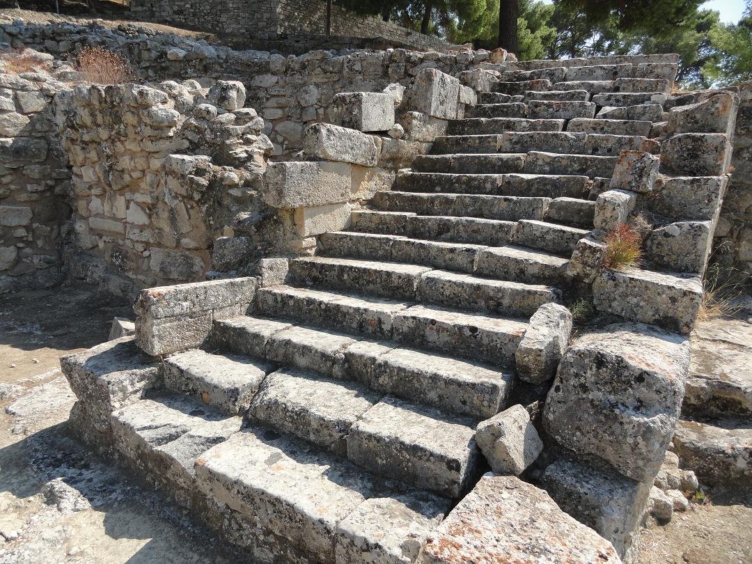 Het Agia Triada paleis heeft van alle Mino�sche paleizen het allermooiste uitzicht. Het ligt op een heuvel en kijkt uit over de Messara vlakte en de daarachter gelegen bergen. Prettig is ook dat het niet zo'n toeristische trekpleister is al bijvoorbeeld het paleis van Knossos, waar de excursiebussen in de rij staan om mensen naar binnen te laden en waar je met honderden mensen tegelijk over de opgraving loopt. Het ligt ook wat meer uit de route en de echt toeristische plaatsen zoals Malia en Chersonissos liggen er een eind vandaan. Hier bij Agia Triada is het relatief erg rustig en kun je je tijd nemen om alles goed te bekijken en eventueel foto's te maken zonder dat Jan en alleman voor je lens springt. Toen wij er waren in september 2011 waren er denk ik ongeveer tien � twintig mensen.