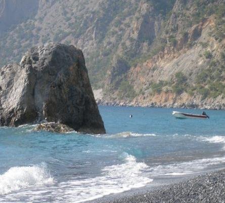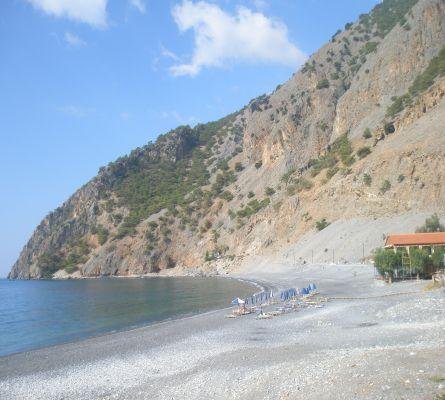 Voor het middaguur en in de late middag, als alle bezoekers aan de Samaria Kloof weer zijn vertrokken, valt de stilte en de rust weer over het dorp Agia Roumeli. In de tussenliggende periode deel je het strand met de vele wandelaars, maar het strand van Agia Roumeli is vrij groot, dus er is altijd wel een plekje te vinden waar je kunt verpozen. Agia Roumeli wordt omgeven door hoge bergen. Langs de kust ten westen van het dorp, en vaak door de bergen uit het zicht getrokken, liggen diverse eenzame strandjes, die worden omgeven door hoge kilffen en die alleen met een boot zijn te bereiken, of via een inspannende wandeltocht. |