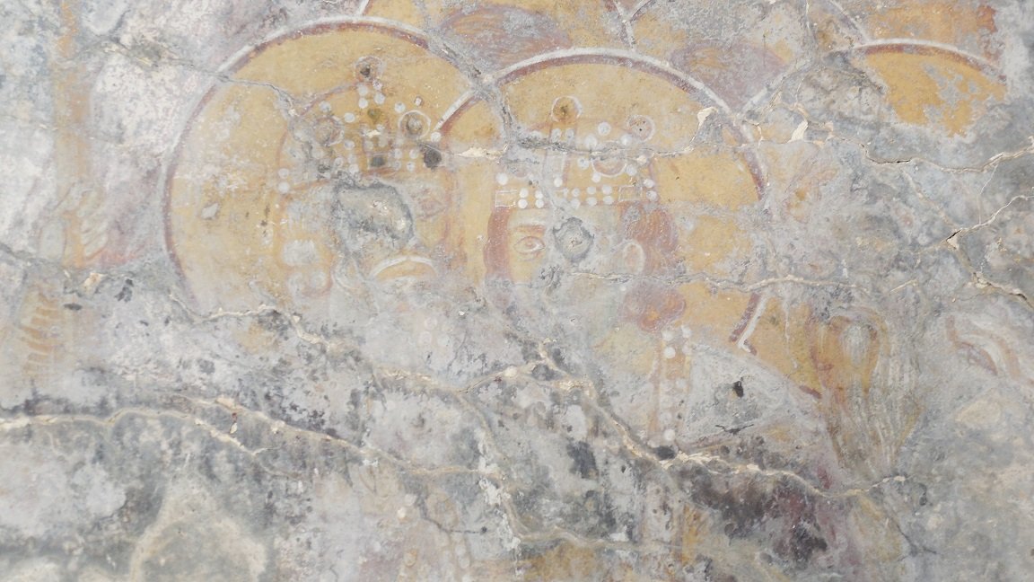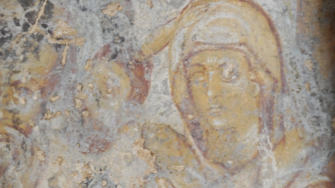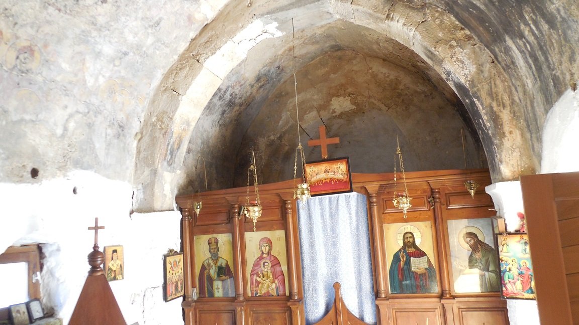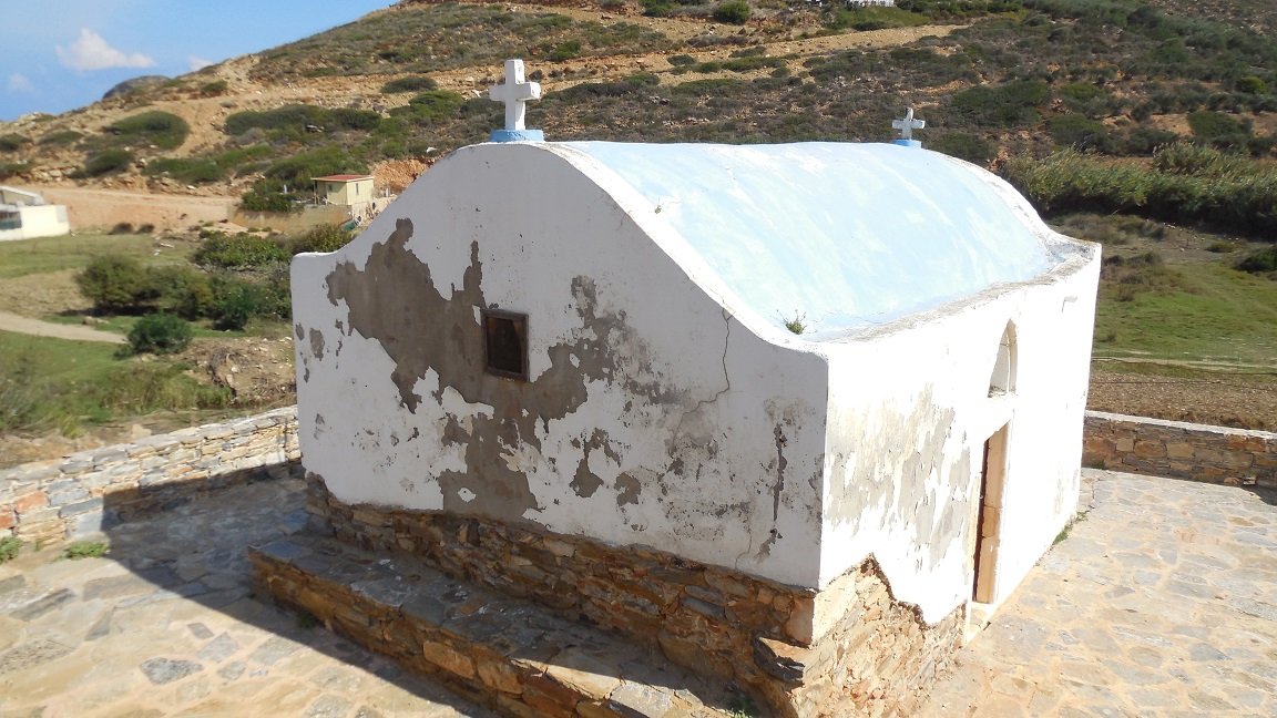 Voordat je het eerste strand tegenkomt is er aan de rechterzijde, op ongeveer 150 meter van het strand, een oud Byzantijns kerkje te zien. Het heeft een blauw dak en maakt een vervallen indruk. Ik kreeg het idee dat ze het wilden gaan restaureren, maar ik kan me vergissen. Je kunt vanaf de weg naar het kerkje lopen. Toen wij er waren troffen we de deur open. Binnen in het oude kerkje zijn de muren versiert met ongerestaureerde fresco's. Het is echt een mooi kerkje voor de mensen die van dit soort oude schilderingen houden. In het echt zijn de fresco's nog veel mooier dan ik ze op de foto heb kunnen zetten.