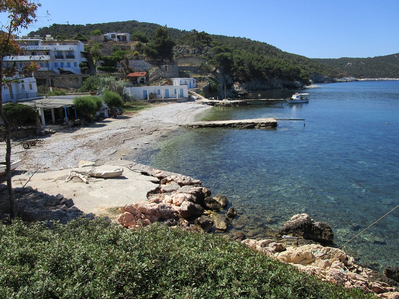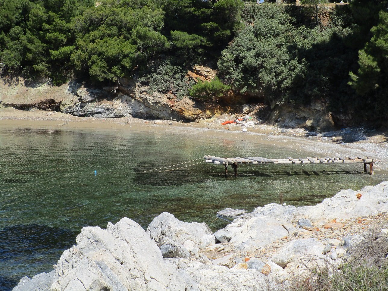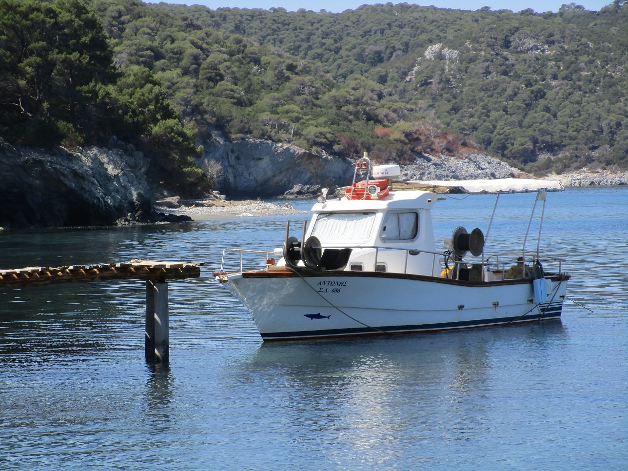 Atsitsa Beach is located on the northwest side of the island. It is set in the Bay of Agios Petros and it is a sandy beach with a number of pine trees around it (but still it can be difficult to find shade here). There are not many facilities and there are no umbrellas and sunbeds for rent. There is something of a tavern in the neighbourhood (on the beach, but not operational yet in May 2018 and opening later in the season), but perhaps it is still advisable to bring water if you go to this beach.