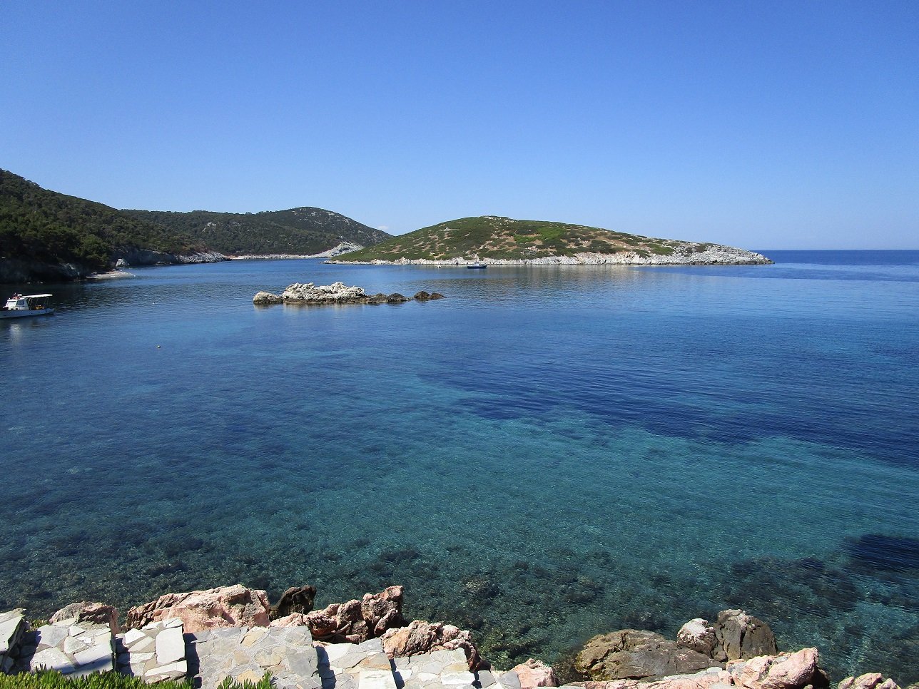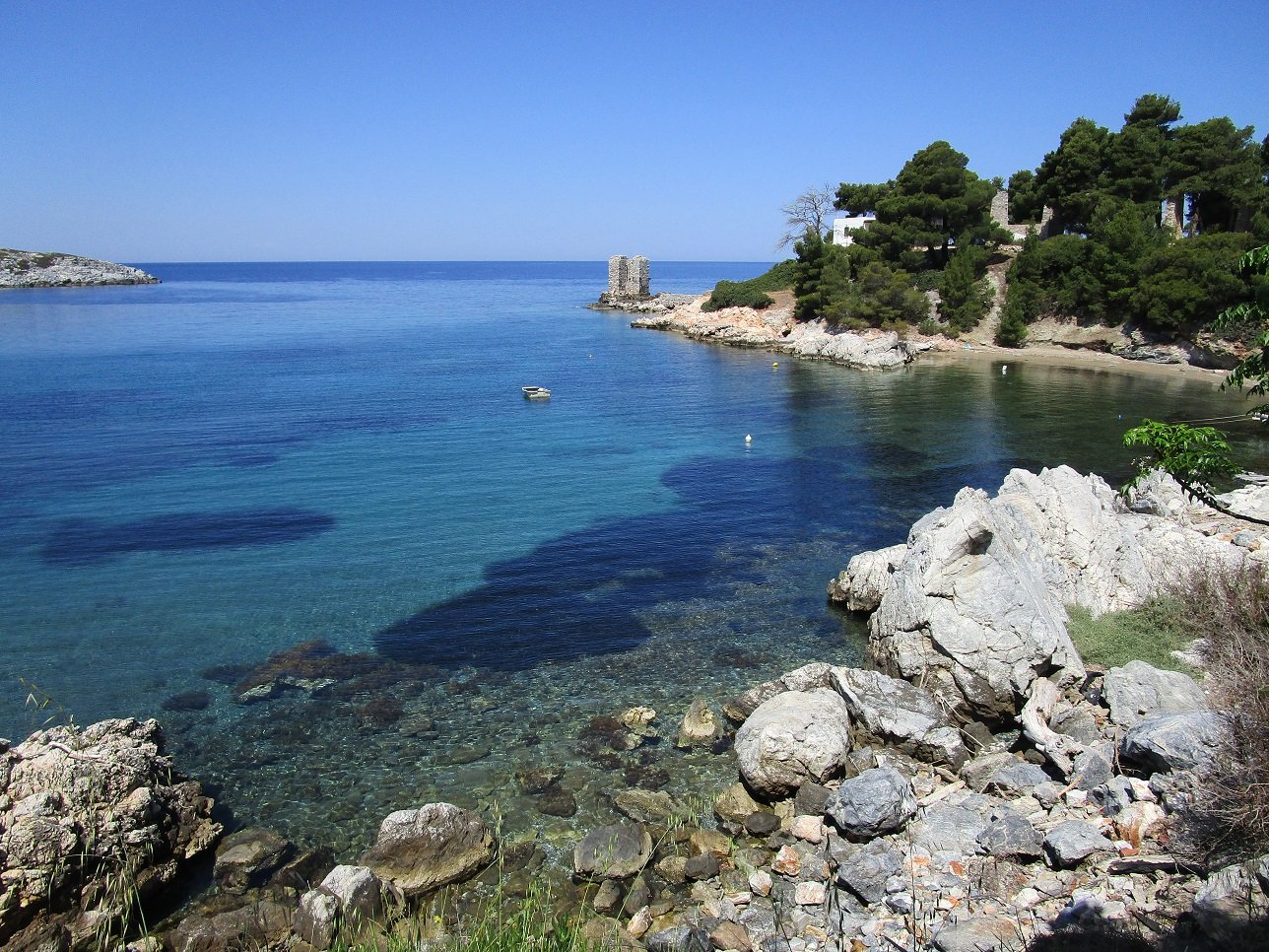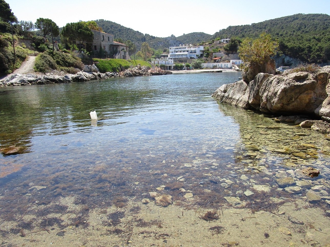 Atsitsa Beach is located on the northwest side of the island. It is set in the Bay of Agios Petros and it is a sandy beach with a number of pine trees around it (but still it can be difficult to find shade here). There are not many facilities and there are no umbrellas and sunbeds for rent. There is something of a tavern in the neighbourhood (on the beach, but not operational yet in May 2018 and opening later in the season), but perhaps it is still advisable to bring water if you go to this beach.