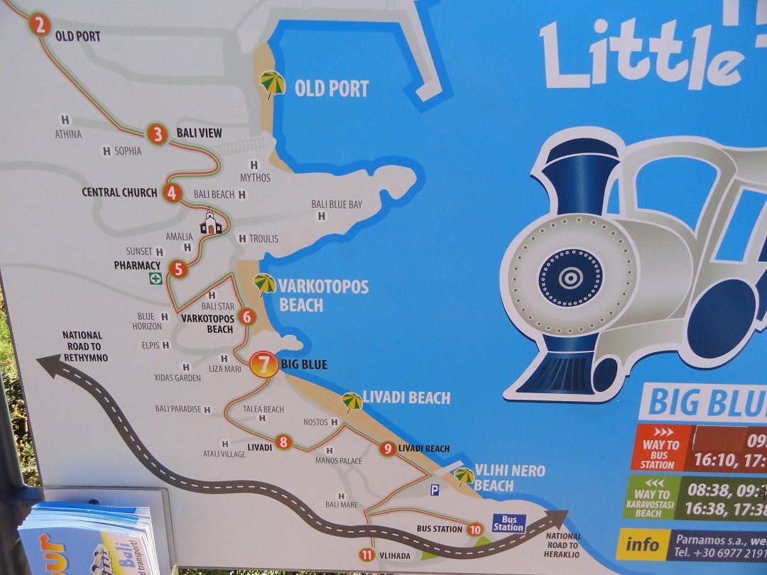 Het dorp Bali is een beetje weg van de snelweg en ligt op een klein schiereiland. Er is geen direct geluid van de voorbijrijdende auto's binnen in het dorp. Voor ons is Bali altijd een leuke stop voor een drankje, een koffie of iets te eten als we vanuit het oosten van Kreta naar het westen reizen (of vice versa). Het is ook een leuk dorp om gewoon eens wat in rond te lopen, omdat sommige delen van Bali nog steeds wel authentiek zijn gebleven en het het gevoel van een vissersdorpje heeft. Er is een regelmatige busverbinding met Rethymnon en met Heraklion (elk uur) maar de bus zet je niet af in het centrum van het dorp. De bushalte is boven bij de snelweg (2008), maar er zijn plannen om het dorp beter bereikbaar te door de bussen misschien in het dorp zelf te gaan laten stoppen. De rit naar Rethymnon duurt ongeveer een half uur en naar Heraklion een uur. In het dorp Bali zelf rijdt een soort treintje dat je naar de diverse plekken brengt, zodat je niet hoeft te klimmen als je daar geen zin in hebt. Rondom de haven en de stranden en in het centrum van Bali is een grote keuze aan restaurantjes en snackbars en er zijn ook diverse supermarkten en een apotheek in het dorp te vinden. |
