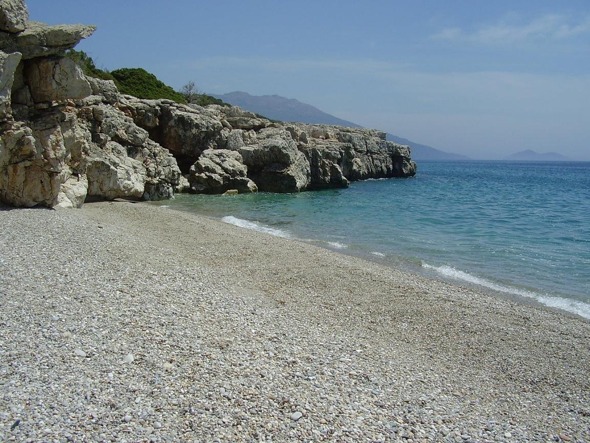 Balos is a quiet village in the south of Samos that is not situated on the main road, and so it is more peaceful than for instance Votsalakia and Kampos. It is set in a beautiful bay and it comes with a large, clean and quiet pebble beach, with clean waters. At the end of this long beach it seems to get a little bit better and there is a little bit more sand. There is a very limited number of sunbeds and parasols for rent on the beach, but for those that want to sit in the shade: there are a couple of large trees on the beach. At the very end of the beach there is also a cave. For those who want to burn a candle: the small church at the end of the road was open. It is not extremely pretty inside, or anything like that, but since most of the churches on Samos seem to be closed... I read also in guides that at the end of the village you could find a dirt track that you can follow to end up in the beach of Pefkos, but we never found it there: the road stopped. If you want to visit the beach of Pefkos you will see the signs at different points on the island (also just before you enter the village) but not here in Balos itself. |