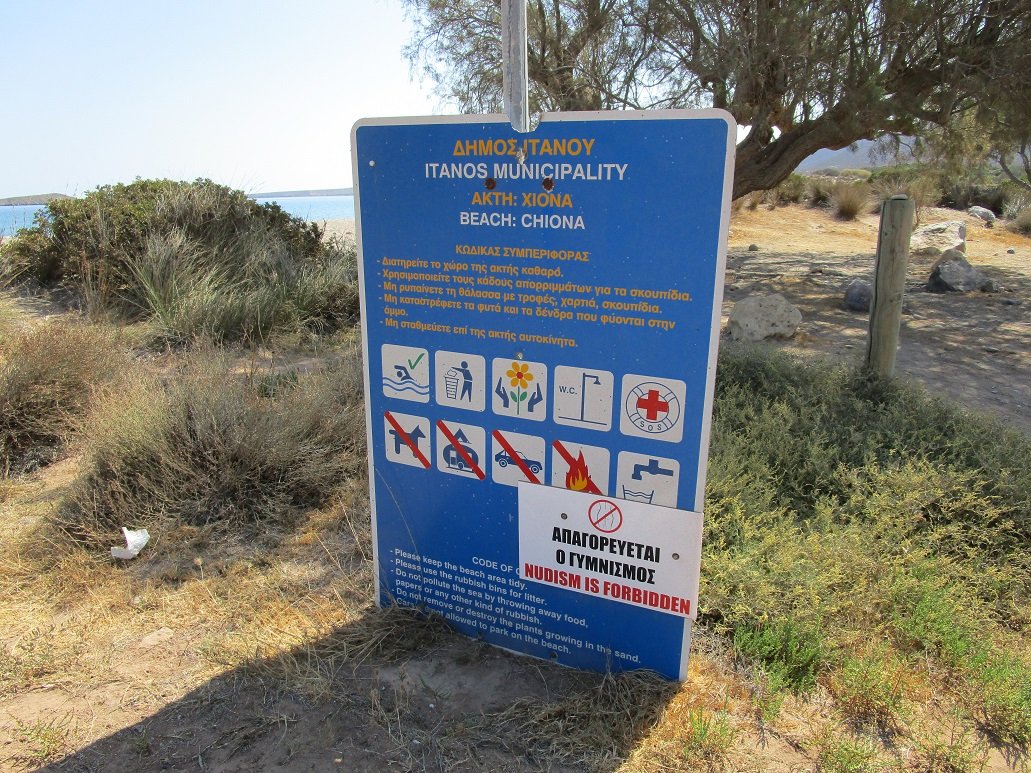 Chiona beach is a beach located in the Lasithi district in the northeast of the island of Crete, two kilometers from the village of Palekastro and near Agathia (distance 1 kilometer). It is a small sandy beach and on the edge of the beach there are two fish taverns where there are also some sunbeds and umbrellas for rent, but there are also some tamarisk trees for those looking for some shade. For the most part of the year the beach is pretty quiet. On the east side of the beach are a few coves where small beaches are hidden. From Chiona you look out on two small islands that lie in front of the coast.