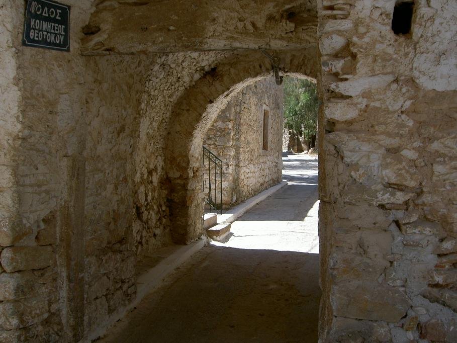 The deserted village of Anavatos on Chios - The road to Anavatos leads through a valley with olive trees and pines. Suddenly you see a rock pop up in front of you. At first glance that rock looks empty, but if you take a better look you can see the small cubic shaped houses on the top. The cliff is surrounded by deep ravines and can only be reached from one side. You can park your car in the parking and then walk up the stairs past the ruins to the village. Originally the village was built on this spot as protection against attacks by the Arab pirates and there were more than 400 homes and several churches. In the massacre that took place in 1822, many people jumped into the ravine. The Turks massacred the people, and put the village on fire. Some people that had escaped and fled later returned and began to rebuild the village. In 1881 during the severe earthquake, all houses were destroyed and after this the last inhabitants left for good. |