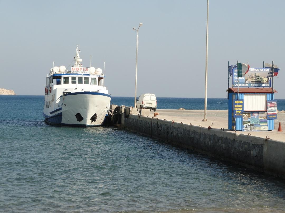 The island of Chrissi, formerly known as Gaidouronisi (meaning "donkey island") is a small island south of Crete. Chrissi is situated 10 kilometer south of Ierapetra (southeast Crete) and can be reached by small excursion boats that leave from this town during the high season. The excursion boats leave in the morning and return around 16.00 o'clock in the afternoon. The journey takes about an hour. The boats arrive in the new port Vougiou Mati, where there is also a taverna.