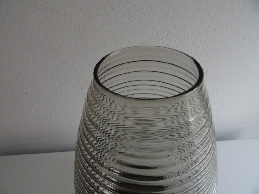 Copier fumi geringde vaas uit 1953, grootste maat druppelvorm - hoogte 29 cmDeze vaas is gemaakt in 1953, ontwerp van Andries Copier. Meestal wordt dit soort vazen een "ribbelvaas" genoemd. Hij heeft geen chips, beschadigingen of grote krassen. Een vaas in goede konditie met heel lichte gebruikssporen zoals te verwachten is bij zo'n oude vaas, maar te verwaarlozen en bijna zo goed als nieuw. Heel mooi exemplaar. Deze maat vaas komt niet vaak voor. Deze vazen bestaan in drie verschillende modellen (het tonnetje en de druppel en een vaas met een cylindrische voet die naar boven breed uitloopt) en in verschillende maten. De grootste maat druppel meet zo'n 29 centimeter. Deze vazen bestaan in de kleuren fumi (zogenaamd rookglas), grijsviolet, olijfgroen en helder glas. De vaas met een cylindrische voet is er met een ribbel die helemaal doorloopt of met een ribbel die halverwege stopt. Bestellen kan via het formulier onderaan deze pagina. Bestelnummer: Copier fumi geringde vaas 29 cm - prijs 89 euro exclusief post.nl verzendkosten (deze vaas kan ook worden opgehaald). VERKOCHT |