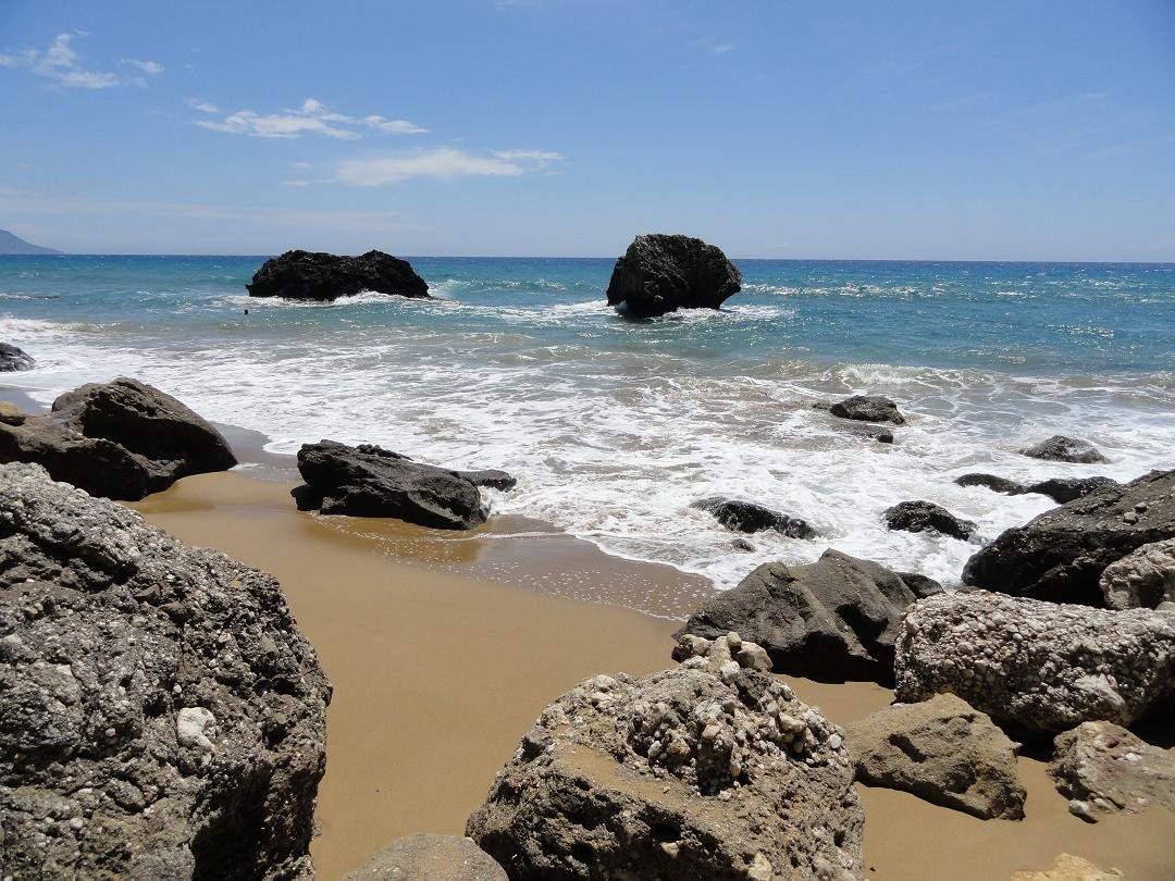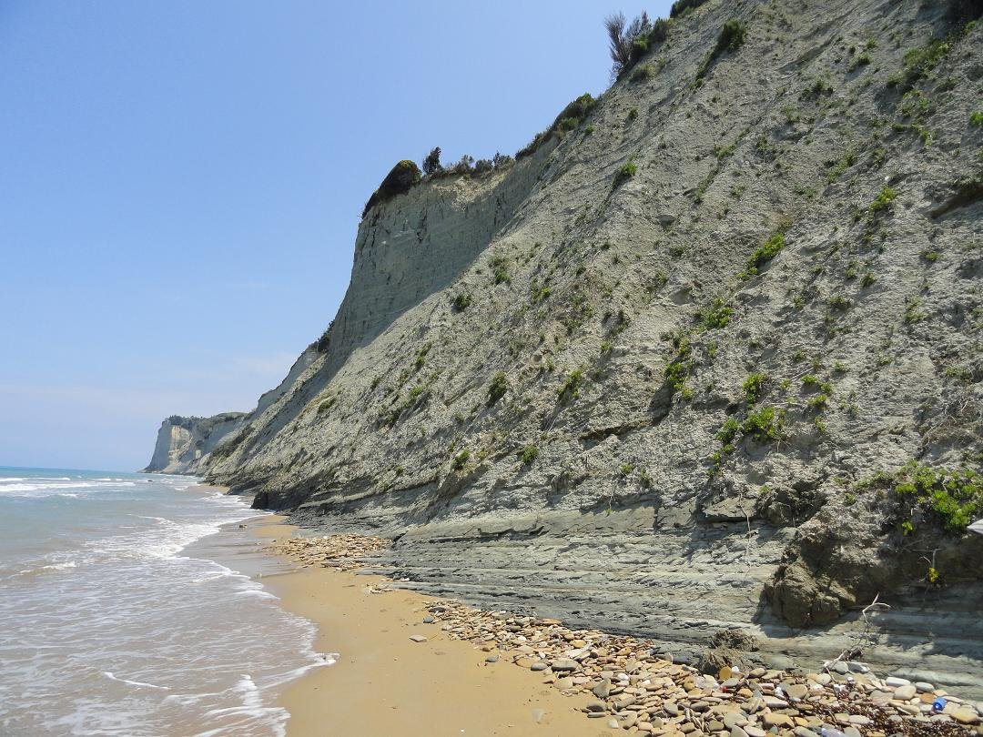 Corfu stranden: Mirtiotissa - Mirtiotissa wordt gezien als een van de mooiste stranden van Corfu. Dit strand ligt ook in het westen van het eiland, even onder Ermones. Mirtiotissa is het enige naturistenstrand van Corfu (voor zover ik heb begrepen, maar in het zuidelijke Agios Giorgios zijn ook stukken strand die officieus als naaktstrand worden gebruikt). Rondom het strand steken de kliffen recht omhoog uit het goudkleurige zand en er zijn veel rotsen waar water in blijft staan en waar mooie vissen in zwemmen. Je kunt het strand bereiken via een steile kronkelige weg vanaf Vatos. Het laatste gedeelte van het strand wordt gebruikt door naturisten. Vlakbij gelegen is het Mirtiotissaklooster dat oorspronkelijk dateert uit de 14e eeuw. Ook hier is er de mythe dat het klooster werd gebouwd nadat er een icoon werd gevonden. Als je alle mythes rondom gevonden iconen moet geloven hebben er ooit meer in de bosje en onder de grond gelegen dan dat er momenteel in de kerken hangen, maar het zou wel de grote hoeveelheden kloosters en kerken in Griekenland verklaren... Het huidige klooster is van een latere datum. Het strand van Mirtiotissa is smal en er zijn weinig faciliteiten. Wel zijn er wat snackbars. Veel kamers zijn er hier niet te huur, alleen bij een taverna onderweg naar het strand. Ook is er nog een pension op 1500 meter afstand van het strand. De weg naar beneden is berijdbaar tot aan het strand maar het kan heel erg stijl worden op sommige stukken. |