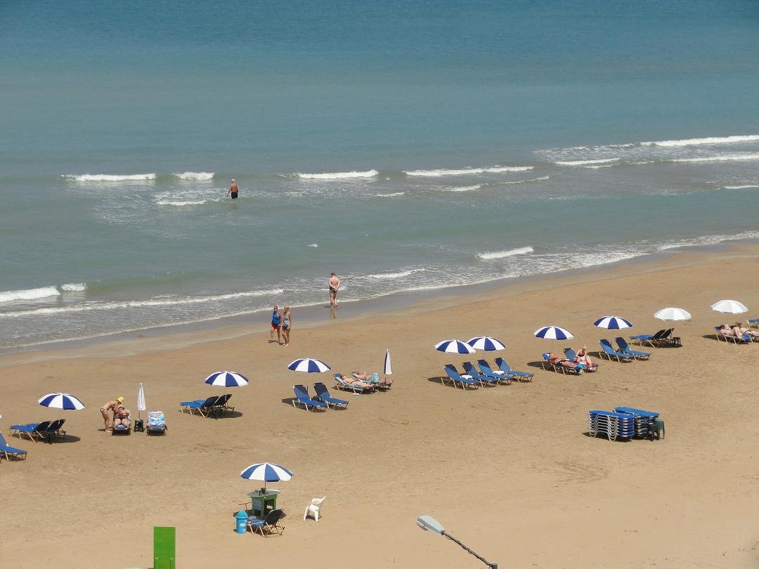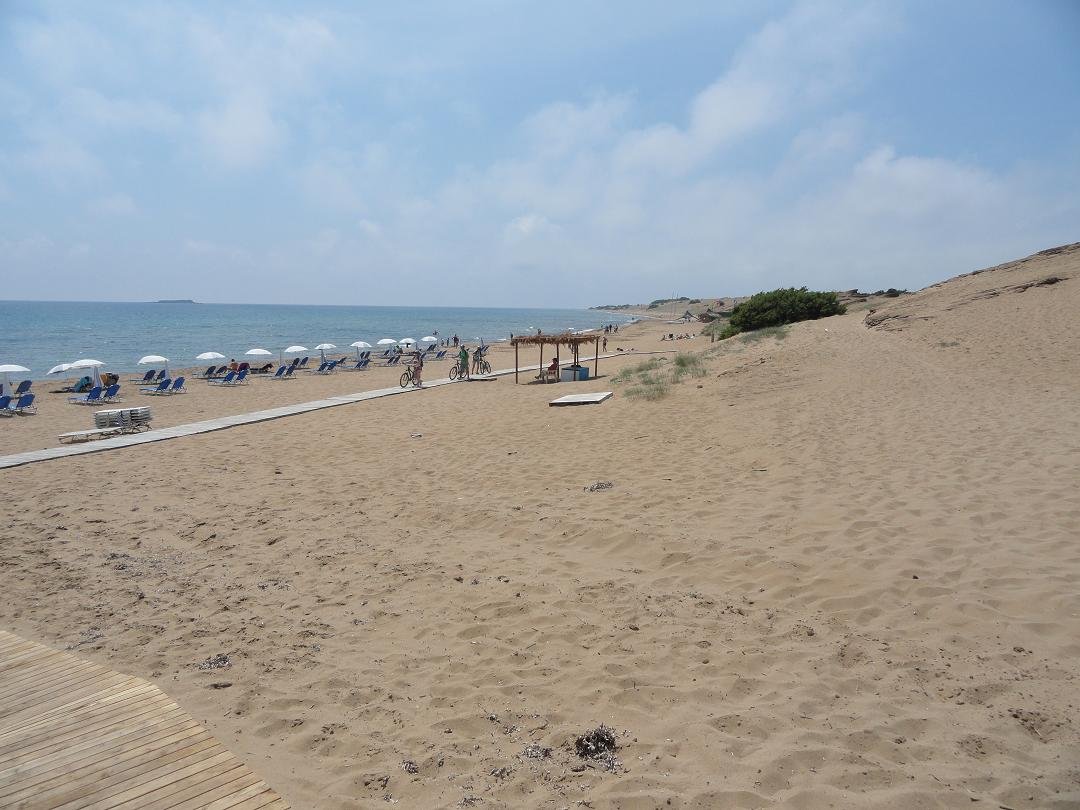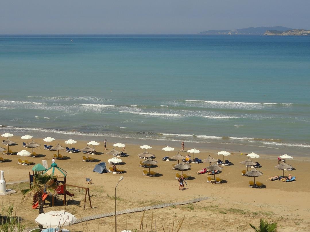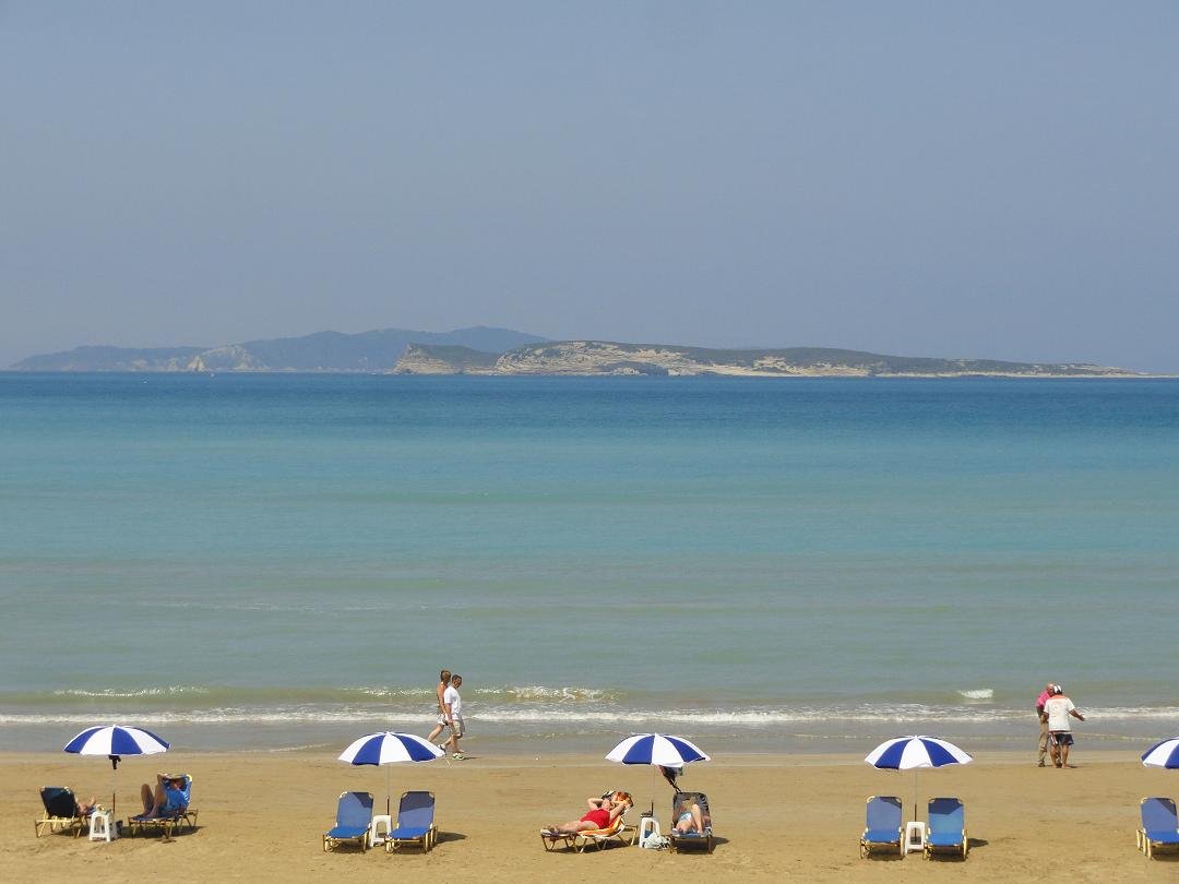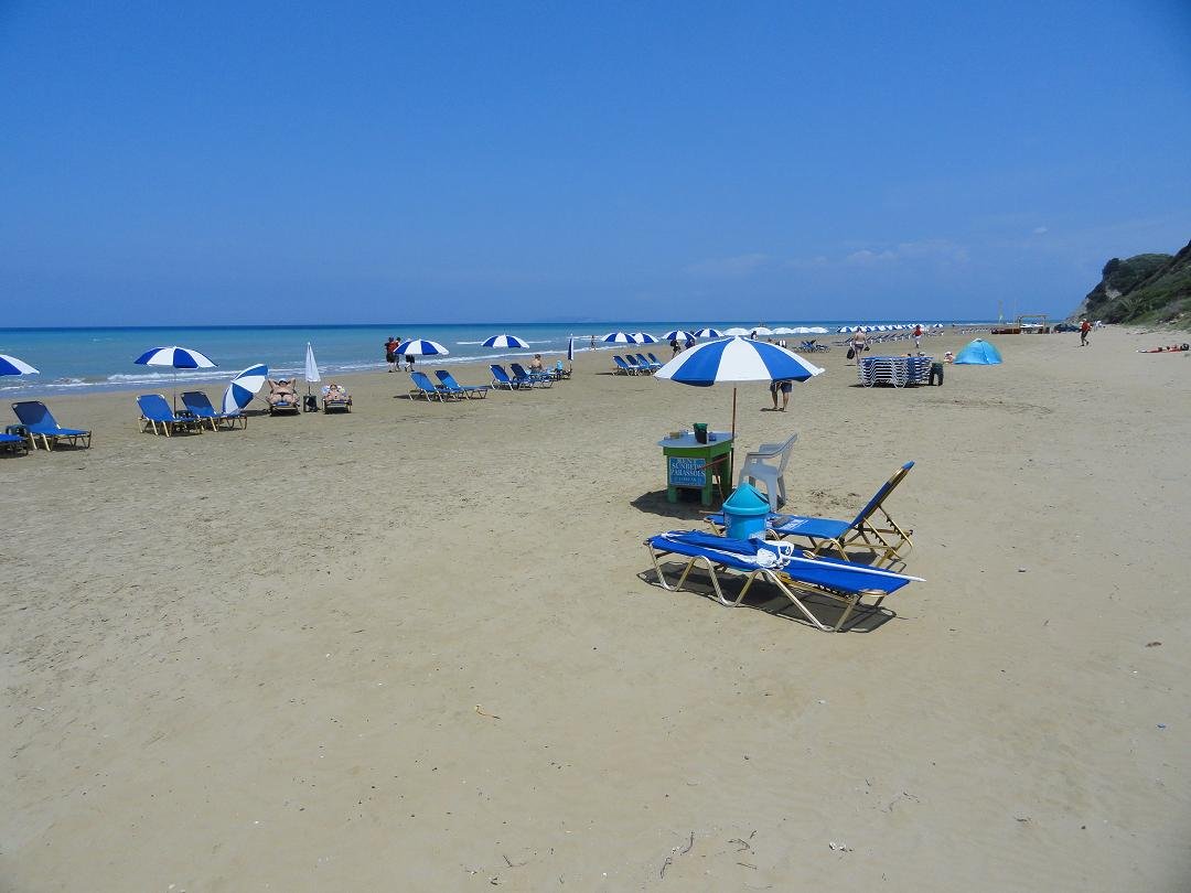 Corfu stranden: Issos Beach - Dit zandstrand ligt aan de zuidwestelijke zijde van het eiland Corfu onder Lake Korission, net boven Agios Giorgios, dat je vanaf het strand in de verte kunt zien liggen. Issos Beach is een lang en breed zandstrand. Het ligt aan het einde van een smalle verharde weg die eindigt op een parkeerplaats. De laatste meters naar het strand gaan over een onverharde weg, die ook met een normale auto te doen is. Bij het strand van Issos is een taverne en er zijn zonnebedjes en parasols te huur. Ook zijn er mogelijkheden voor watersport. Het stuk aan de noordkant van het strand, daar waar geen verhuur van zonnebedden is, wordt ook gebruikt door naturisten. Daarbij moet wel gezegd worden dat dat gedeelte van het strand niet was schoongemaakt toen wij het bezochten en dat er daarom veel zeewier en nogal wat rommel op lag. In de zee tegenover het strand ligt het eilandje Lagoudia. |