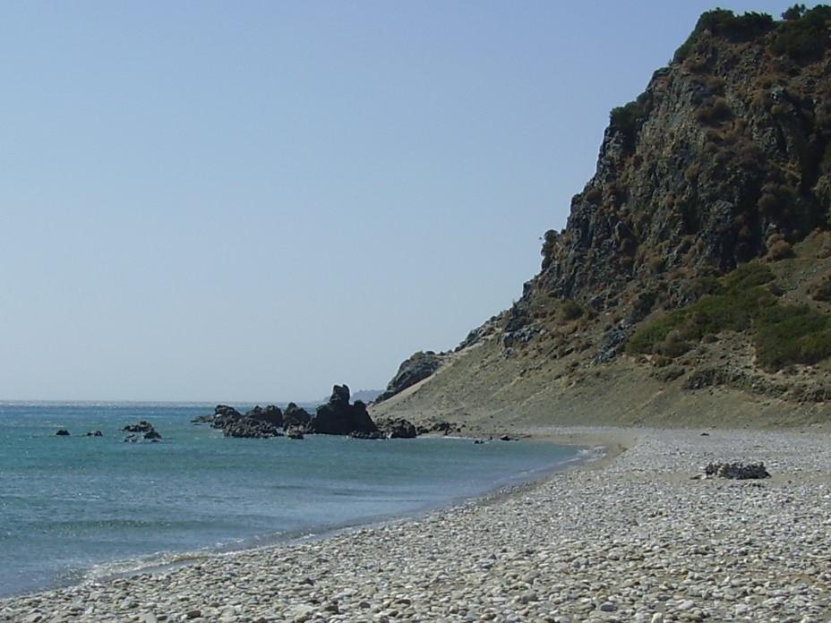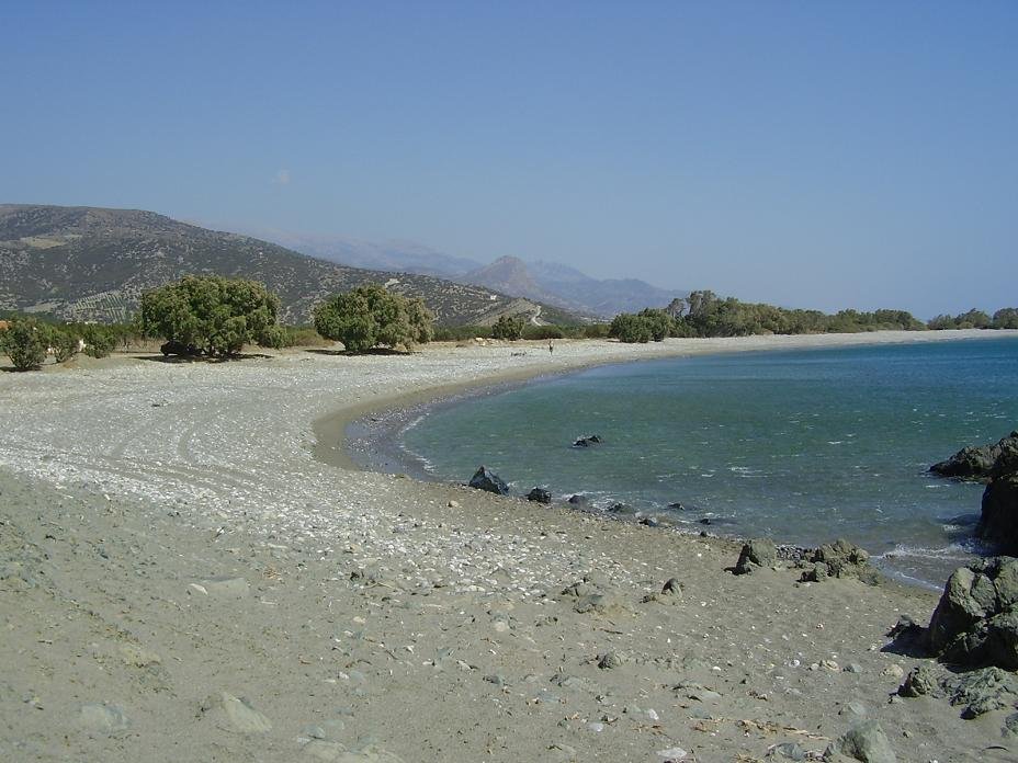 Het strand van Dermatos ligt in het zuiden van Kreta langs de weg op de route van Tsoutsouros naar Keratokampos. Het strand is een paar honderd meter lang, met keien en zand. Aan een zijde van het strand naast een heuvel staan mooie rotsen in de zee. Toen wij er waren in 2007 stond er maar 1 huisje en hebben we er zonder zwemkleding gelegen - dus in casu was het op dat moment een naturistenstrand. Het is er vrij rustig, alleen komen er soms wat nieuwsgierige mensen een kijkje nemen omdat je het strand vanaf de weg kunt zien liggen. Er loopt een klein pad vanaf de hoofdweg naar het strand toe. Het is er wat lastig de zee ingaan vanwege de keitjes aan het begin van het water