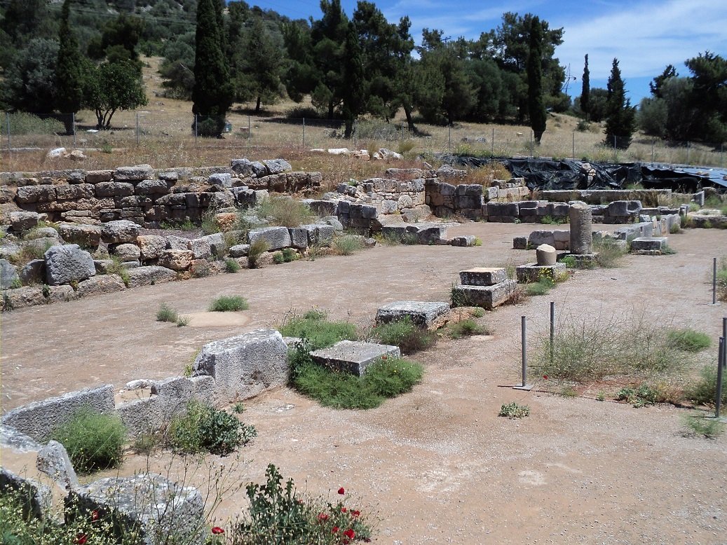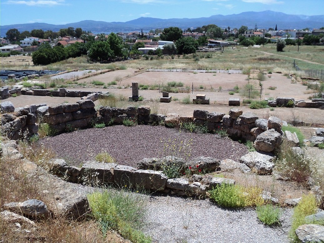 Eretria is a nice little coastal town on the western side of the island of Evia about 22 kilometers south of the capital Chalkida. There is a seafront promenade with hotels and there is a beach. In ancient times Eretria was an important city that flourished in the 6th and 5th centuries BC. On the edge of the village (north on the left side as you drive north) along the road are the remains of the old town. There are remains of houses, an acropolis, two palaces, a gymnasium, a number of temples and a theatre. The site is not maintained and most of it was overgrown by weeds and plants. A large part of it (the part with the columns laying on the floor??) was also covered with plastic and not visible.