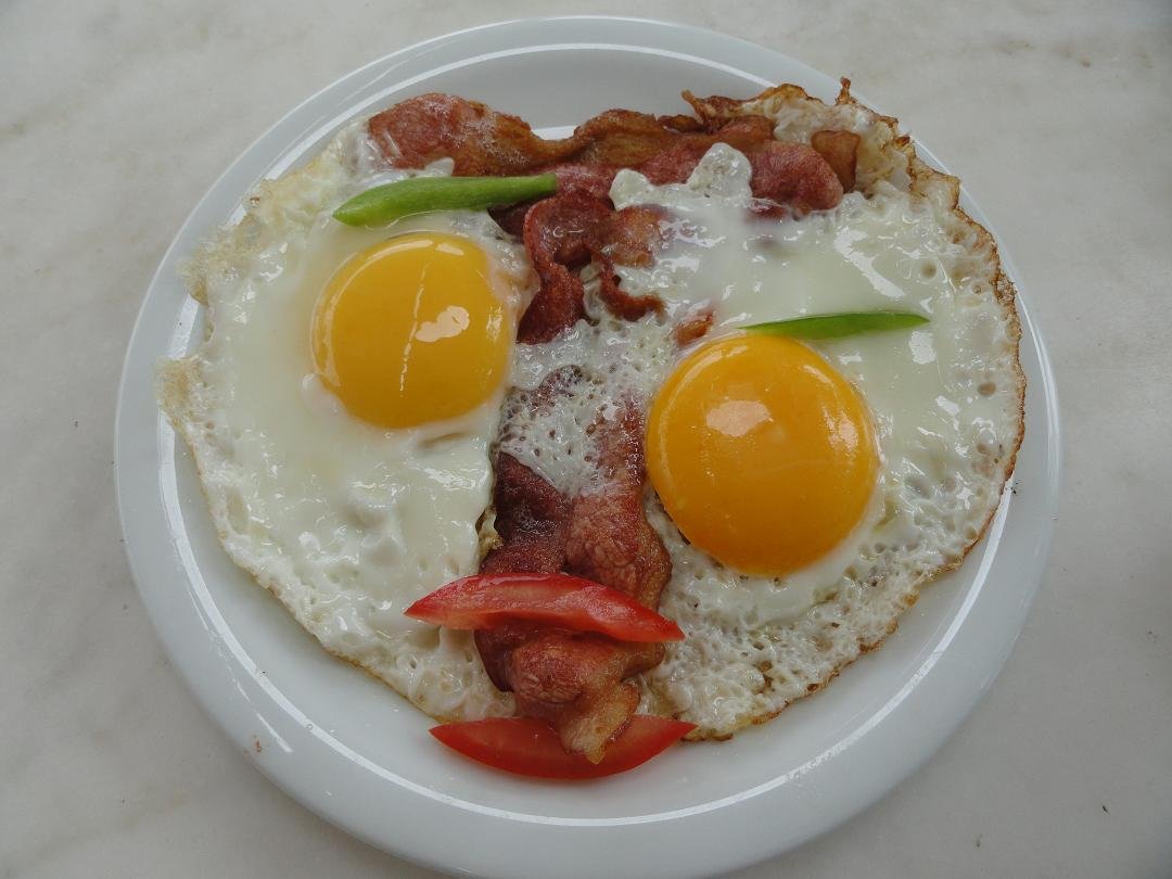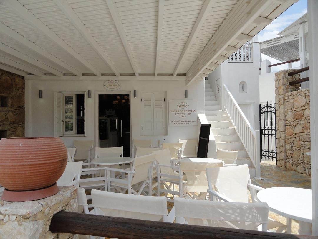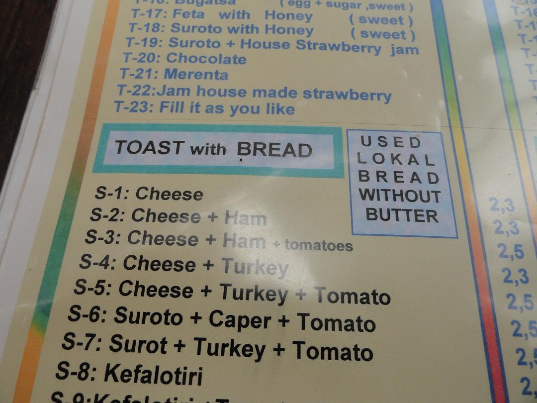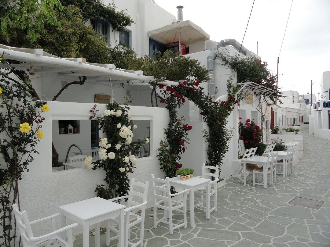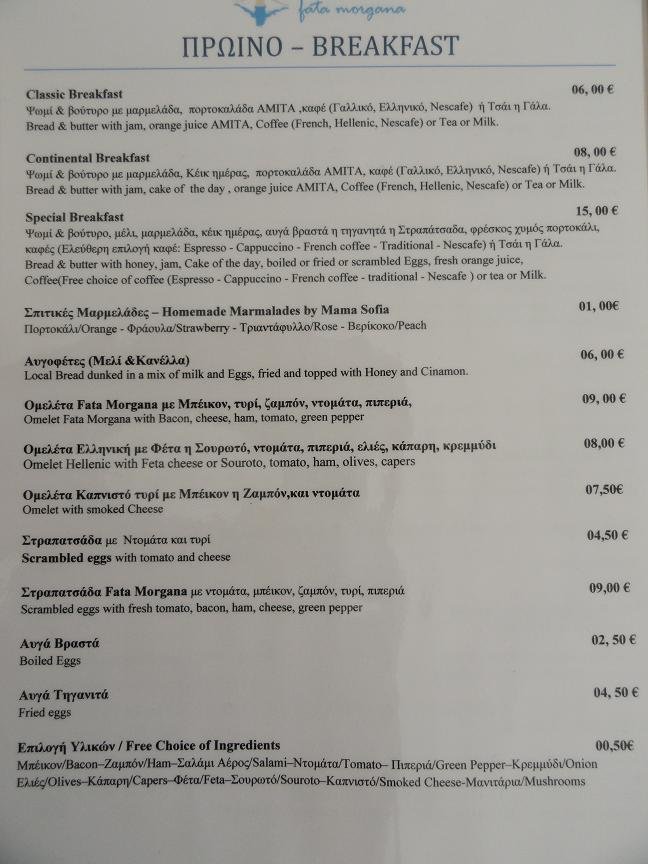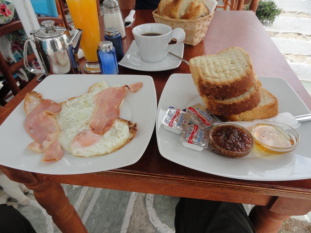Taverna Nicolas Place is gelegen op het grote plein met de kerken in de Chora. Het is vrij druk met mensen die hun e-mails checken op hun laptops, want er is wifi beschikbaar. Ze serveren ontbijt, lunch en diner. Er is yoghurt met fruit en honing, verschillende soorten omeletten, pannenkoeken, ijs, gebak, toast, salades, gegrild vlees en kip, vis, spagethi ...afijn ik kan nog wel dagen door blijven schrijven ik kon gaan en op. Het menu is zo uitgebreid en verwarrend en er staat bijvoorbeeld ook "brood met toast" ... we konden moeilijk beslissen wat we wilden bestellen en het duizelde ons zo vroeg in de ochtend toen we alleen een eenvoudig ontbijt wilden hebben en een paar dingetjes om uit te kiezen. We bestelden de bacon en eieren en een cappuccino. De eieren die werden gebracht waren half rauw en nog koud aan de binnenkant, met zowel het eigeel en het eiwit nog vloeibaar. Niet mijn idee van een jummie ontbijt. De cappuccino was met veel te veel melk en het was moeilijk om de koffie nog te proeven. Naast dat het was het ook nog eens echt duur: 4 eieren, 4 plakjes bacon, wat toast en twee kopjes koffie voor 18 euro (2011). Voor dat geld vind ik dat er wel verse sinaasappelsap en wat boter en jam bij had kunnen zitten. De ober deed dat niet alleen bij ons maar bij alle tafeltjes. Vreemd was ook dat zodra iets op of leeg was het meteen weg werd gehaald zonder dat er gevraagd werd of je klaar was: bord leeg? weg! glas leeg? weg! kopje leeg? weg! Ons oordeel: duur, rauwe eieren, verwarrend menu en niet echt goed: eet smakelijk, een 5 uit 10 |