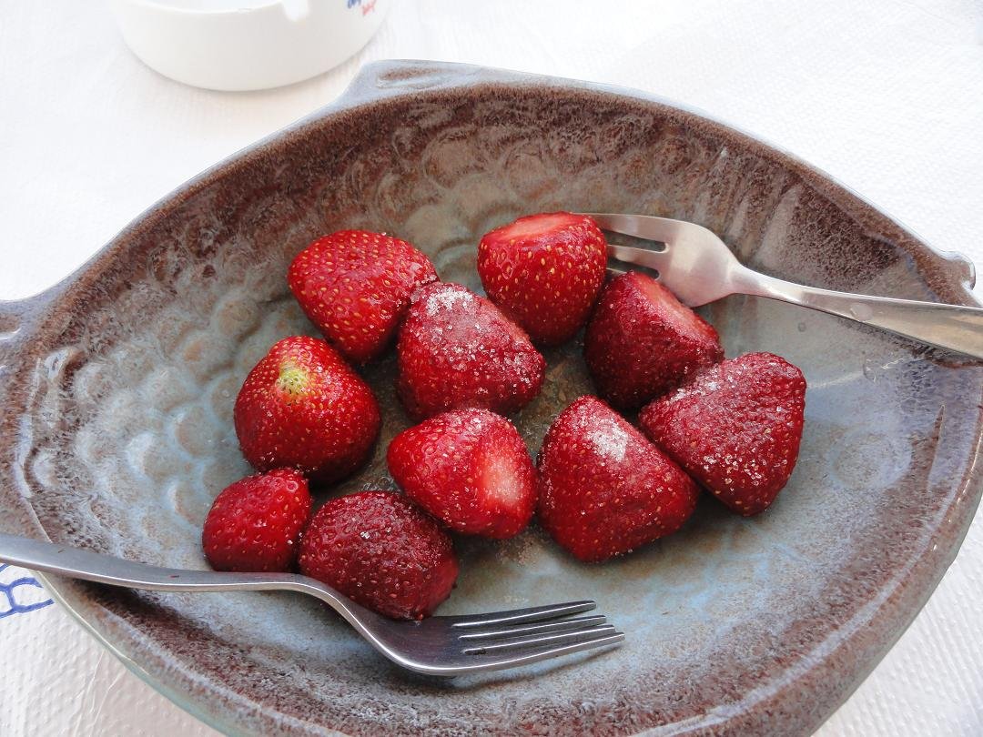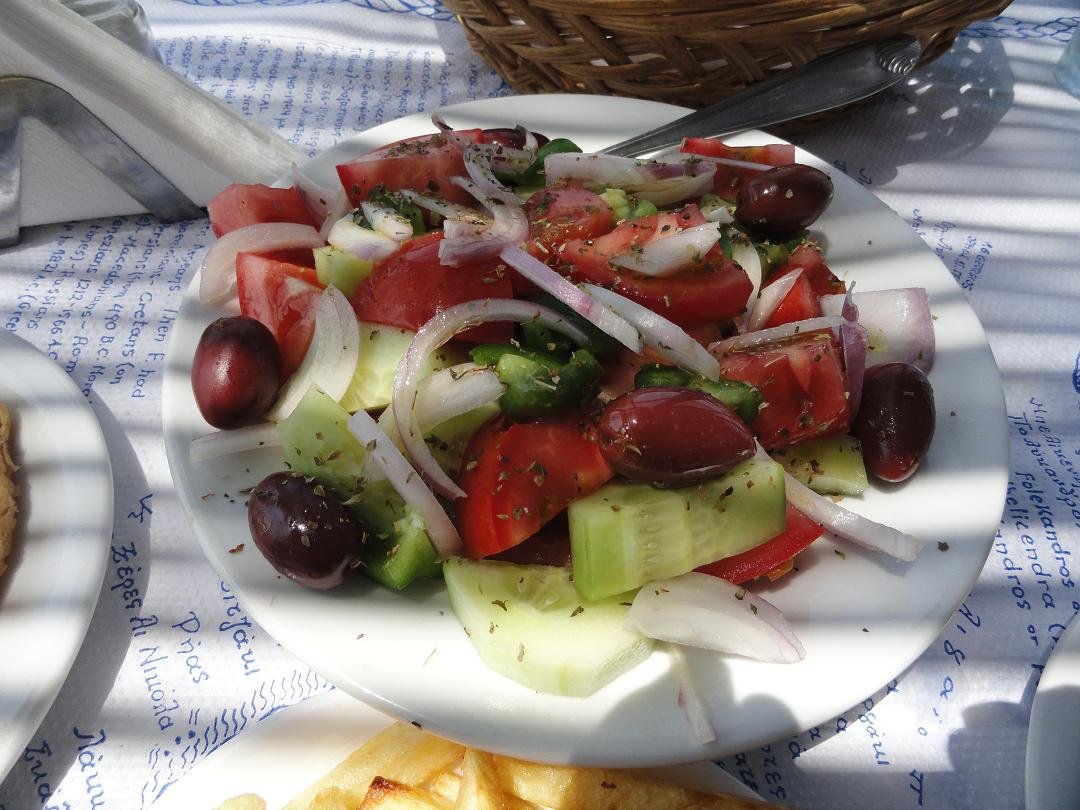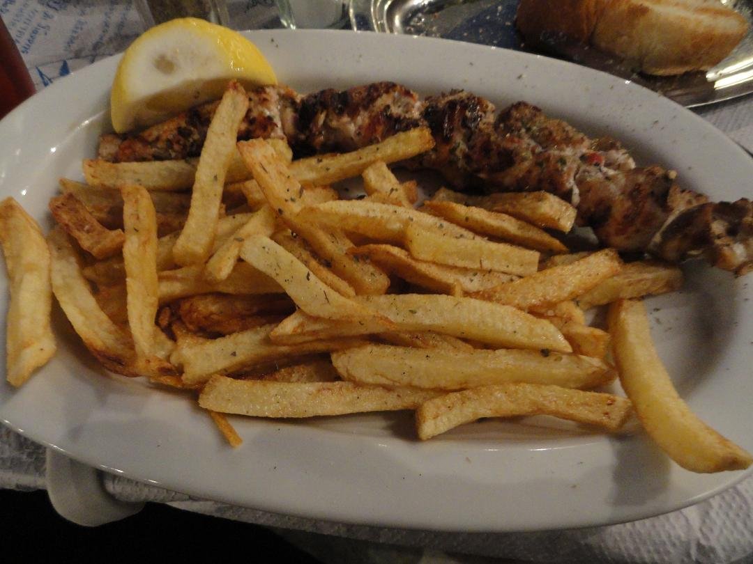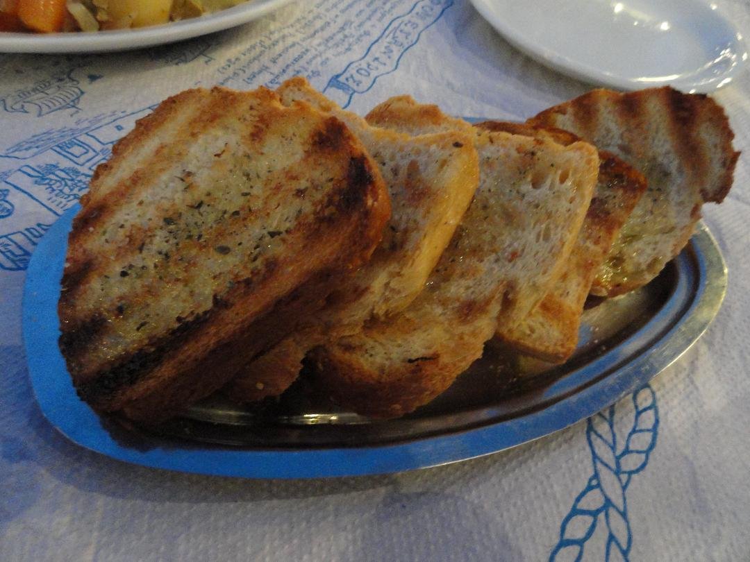 Gelukkig maar dat we de Evangellis Beach Bar verlieten zonder wat te bestellen. Een straatje hoger, achter het kleine witte kerkje vonden we deze gezellige taverna (moeder en dochter, allebei even vriendelijk). Onze drankjes stonden meteen op de tafel: twee fanta's voor maar 1,50 euro per stuk (2011). Naderhand zijn we nog een keer terug gekomen om er te eten en we bestelden er heerlijke verse vis die met een lekkere olijfolie met kruiden werd geserveerd. We kregen er lekker gekruide toast bij met olijfolie en kruiden besprenkeld en een schaaltje olijven. Voor bij de fles water brachten ze een koeler met ijsblokjes. Na afloop kregen we nog gratis een schaaltje met lekkere zoete aardbeien. Traditioneel Grieks eten maar dan wel goed. Ons oordeel: goed en met een hele vriendelijke bediening, een 8 uit 10 |