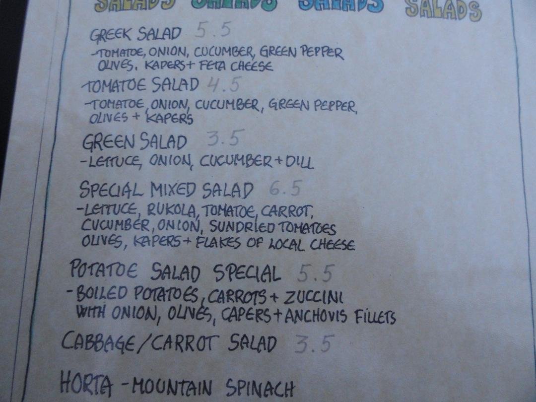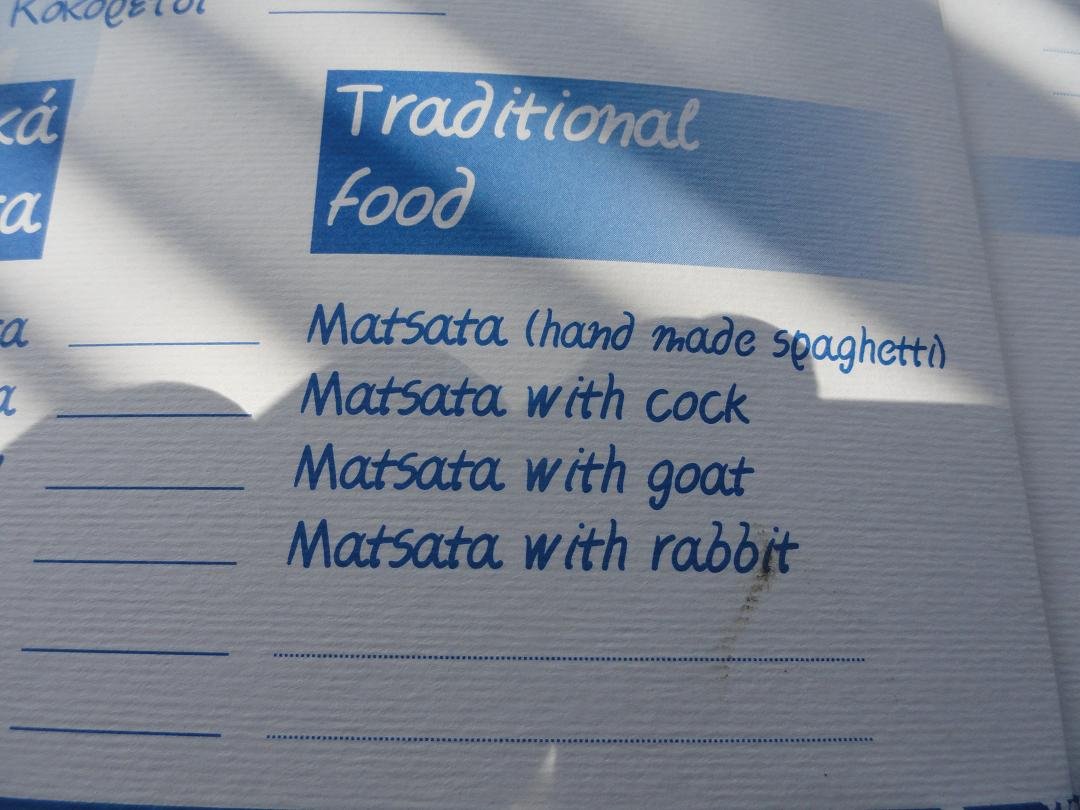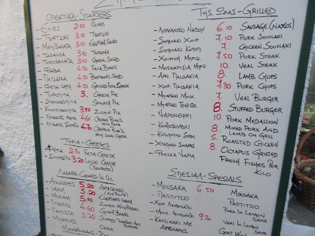 Ano Meria is beroemd om zijn "matsata", de zelfgemaakte pasta, en dus hadden meerdere mensen ons op het hart gedrukt dat we dit moesten eten wanneer we in Ano Meria waren. Zelfs mijn vriendin Anna van het eiland Paros die ik die dag nog aan de telefoon had, vertelde me dat ik het dorp niet kon verlaten zonder dit gerecht te eten. Dus liepen we van Chora naar Ano Meria vol verwachting uitkijkend naar de bijzondere lunch met deze beroemde heerlijkheid. Na een uur lopen kwamen we deze vriendelijk ogende taverna tegen met uitzicht op de dorpskerk en we gingen zitten voor onze matsata. Maar helaas toen we naar het menu keken (je moet zelf ook maar even kijken en op de thumbnail hierboven klikken om de foto uit te vergroten!) waren de prijzen voor de matsata gerechten niet ingevuld en ze werden ook niet geserveerd. Dus teleurgesteld besloten we om in plaats daarvan maar wat van de andere gerechten te proberen. Ik wou dat ik kon zeggen dat het allemaal heerlijk was, maar het enige lekkere dat ze op onze tafel hebben gezet waren de fles water en (verrassend) de patat (warm en knapperig!). De saganaki (gebakken kaas) was zo hard als een rots en je kon gemakkelijk je tanden erop breken, de Griekse salade had geen feta-kaas erop en de tzatziki was ook niets bijzonders. Mijn tip is om een stukje verder te lopen naar de volgende taverna (veel slechter dan deze taverna lijkt me onmogelijk) of koop lekker een zak chips en wat bananen in de supermarkt die net voor de taverna zit. Ons oordeel: vreselijk slecht, maar vanwege het water en de frietjes een 3 uit 10 |