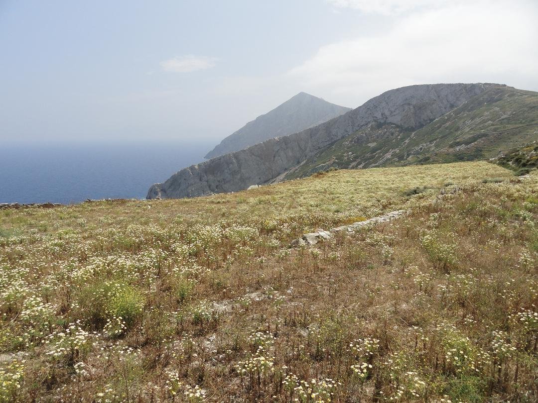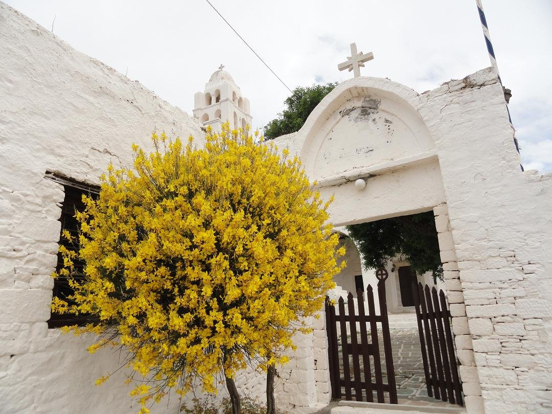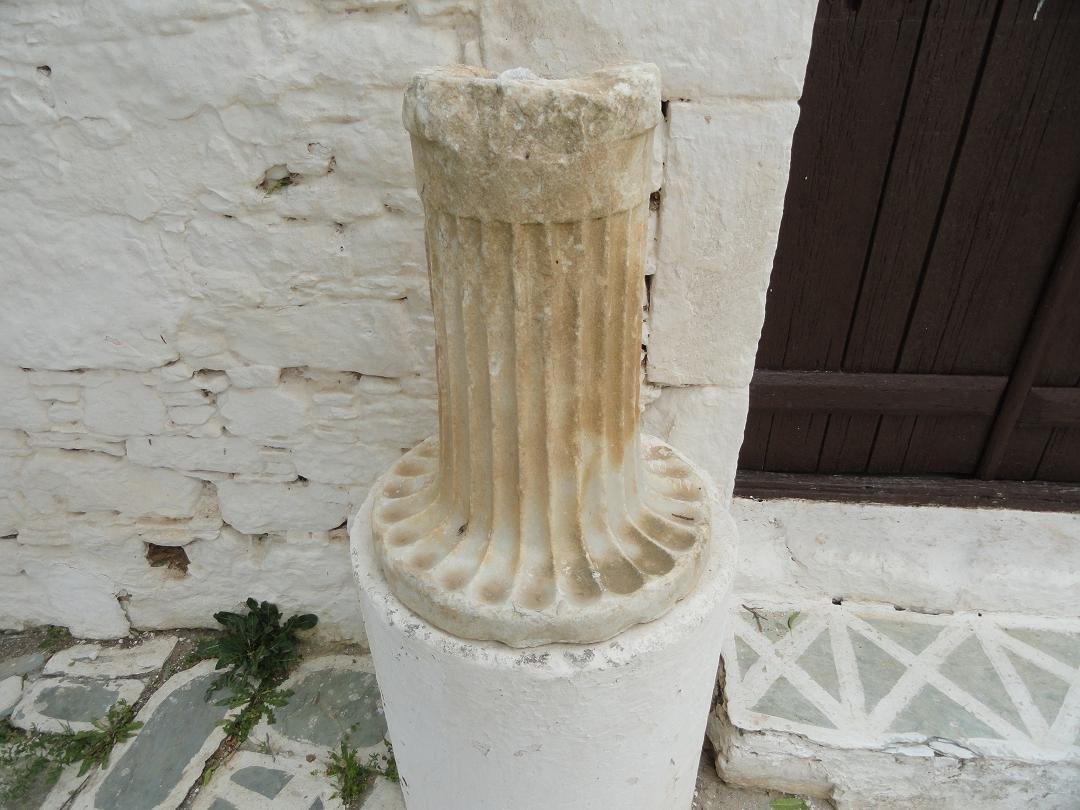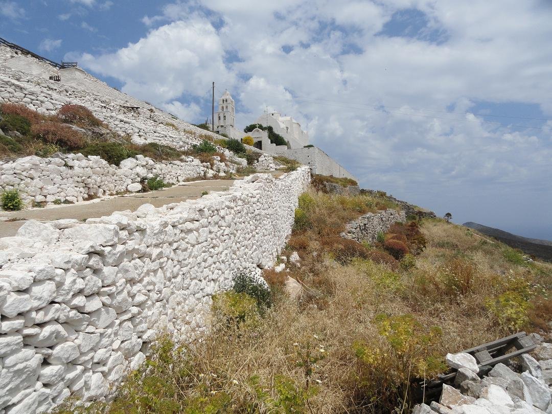 On the northeast side of Chora on a cliff hill stands the beautiful 19th century white Panagia Church on the foundations of ancient city walls and an ancient sanctuary / temple of Artemis. Old stones from the temple ruins were used to build the church. The church is dedicated to the Assumption of the Virgin Mary and was built after an islander miraculously saved a silver icon from some pirates (and these all drowned). This icon of the Virgin Mary can still be seen inside the church. The inside of the Panagia is very attractive and defenitely worth a visit. You can see ancient inscriptions and bases of statues from the Artemis temple in the interior and at the courtyard wall of the church. From the hill where the church is situated there are wonderful views over Chora, the island of Folegandros and the sea. Note: off course this church was closed (as most of the churches in Greece are) and we haven't heard of anybody that was there at a day or time when it was open. So no icon of Virgin Maria for us or anybody else. There are a few remains of the temple outside (columns, part of a statue) that you can take a look at. The picture of the inside of the church was made with the camera through a window and it shows quite clearly what it looks like (in fact it shows more than if you just peek through the window yourself). |