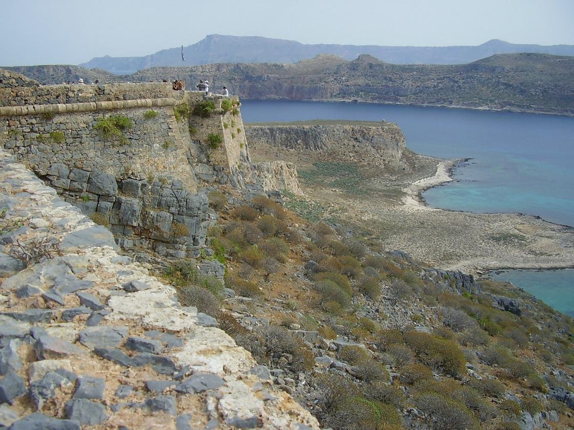 Het kasteel van Gramvousa werd gebouwd tussen 1579 en 1584 door de Venetianen. Het was al vernietigd in 1588 toen het door de donder werd getroffen die in het buskruit terechtkwam. Het kasteel werd herbouwd in 1630. Het is bijna driehoekig van vorm en elke zijde is 1000 meter lang. Gramvousa staat ook bekend om haar aandeel in de strijd van de bevrijding van Kreta van de Ottomaanse Turken. 3000 Revolutionairs gebruikten het eiland 3 jaar lang als hun onderdak. Wegens gebrek aan voedsel gingen ze over op de piraterij. Gramvousa was een van de laatste plaatsen om te worden veroverd door de Turken (in 1692 vermoedelijk nadat de Venetiaanse commandant was omgekocht door de Turken) en het was het eerste gebied van Kreta om te worden bevrijd van de Turken in 1825 nadat de Kretenzers vermomd als Turken op de burcht binnendrongen (de bevrijding van de rest van Kreta volgde in 1898). Een Engels-Frans garnizoen nam het eiland Gramvoussa in 1828 in. Vandaag de dag is het niet alleen een toeristische attractie, het eiland Gramvousa is ook een belangrijk toevluchtsoord voor vogels en er zijn er zeldzame planten te vinden. Het is het leefgebied van meer dan 100 vogelsoorten en 400 soorten planten. Enkele van deze planten en vogels zijn beschermde soorten. Op het gebied leeft de mediterrane zeehond in de zee grotten en de Caretta schildpad is er op zoek naar voedsel. Vlakbij de plek waar je de boot afstapt en tegenover een kleine kerk is er ook een leuk strand waar je kunt zwemmen in de zee. Aan het einde van een pad zijn de resten van een gezonken, roestige boot te zien. |