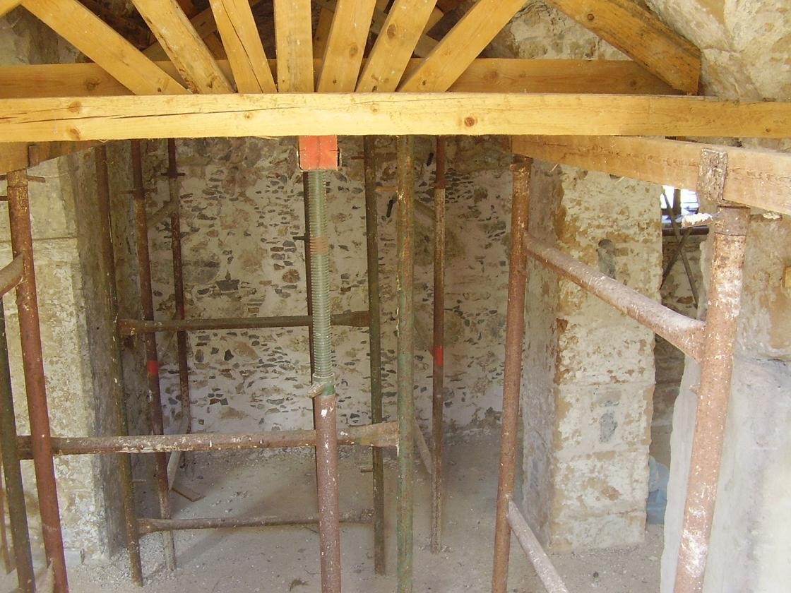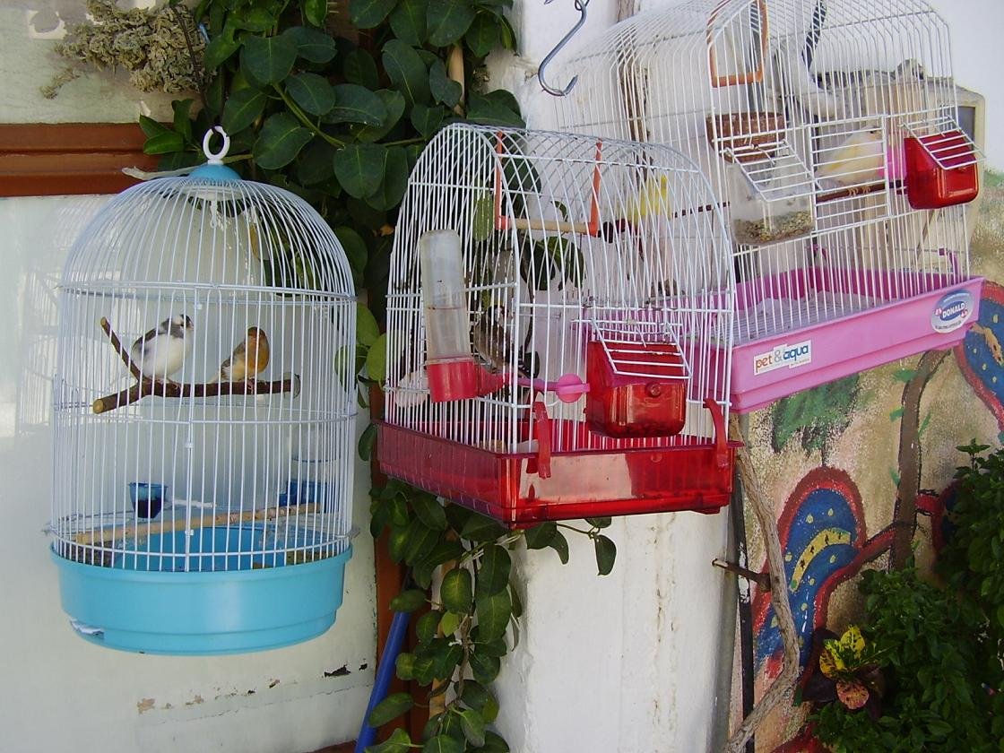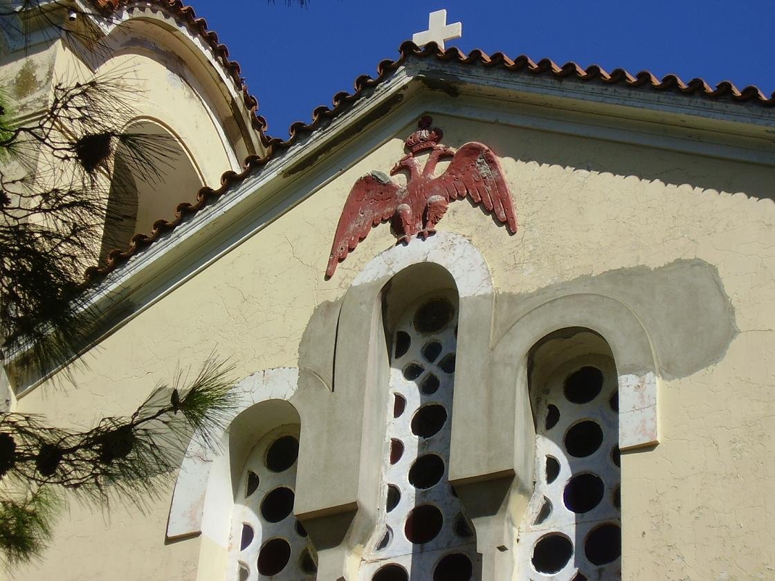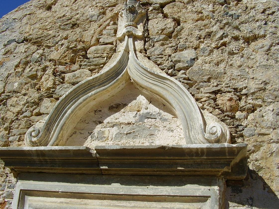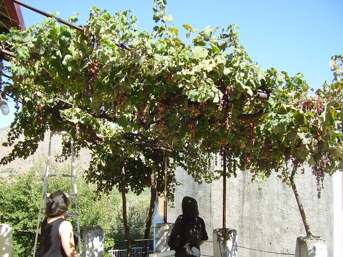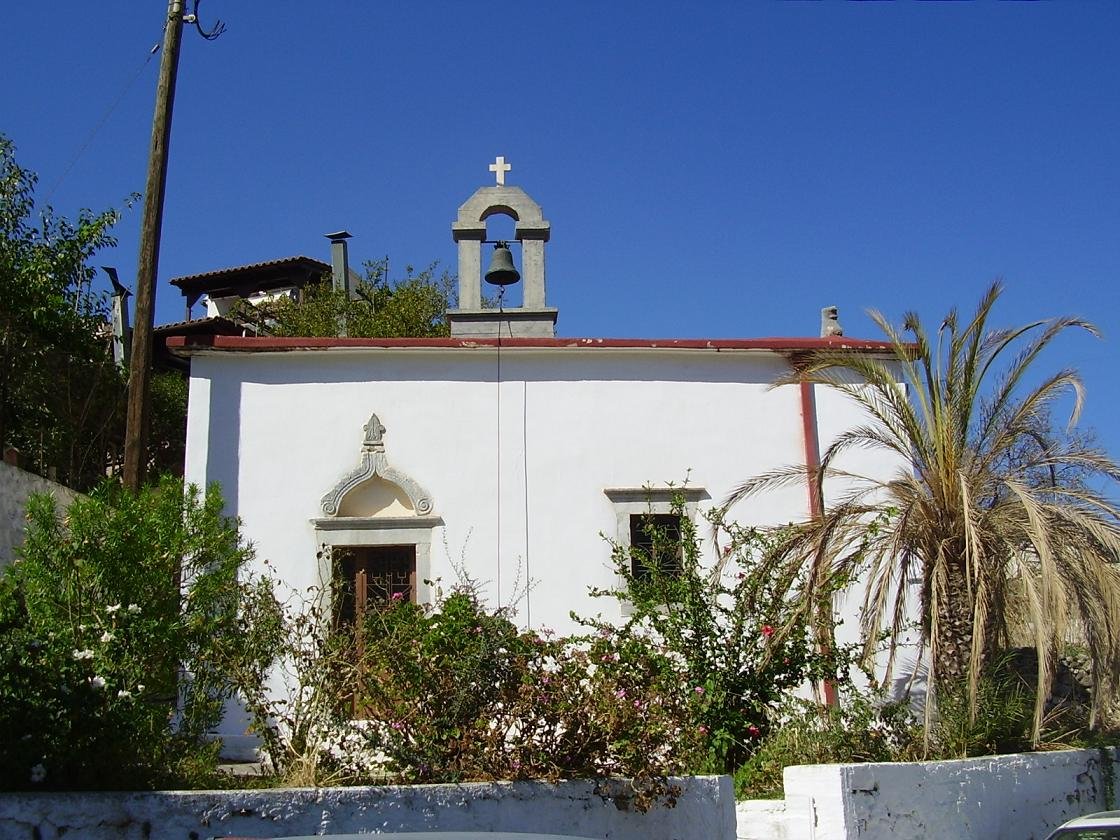 Aan het begin van het dorp Houmeriakos staat de grote gele kerk met zijn koepel en zijn torens, die omlijst is door hoge cypressen. De verf bladdert er hier en daar een beetje vanaf. Als je door de straatjes gaat lopen zie je meteen naast de kerk een monument dat helemaal is omgeven door een bramen-struik. Ook staat er een miniatuur kerkje. In de straatjes staan de vervallen huizen naast de helemaal opgeknapte. Op veel plekken staan potten met bloemen en we kwamen ook vogeltjes tegen die in een kooitje aan een huis hingen en vrolijk zaten te fluiten. Er staan fruitbomen en voor de huizen hangen trossen met druiven vanaf houten balken, die geplukt kunnen worden (september / oktober). Er zijn veel kerkjes in dit dorp en ook is er een oude bron op een van de pleintjes. Als je doorloopt en het bord volgt dat langs de kant van de weg staat (zie foto beneden - wit bord met een rode pijl) kom je bij een leuk oud kerkje, de Panagia Koumpelidiki (onze lieve Vrouwe van de koepels) dat dateert uit de 11e eeuw. |
