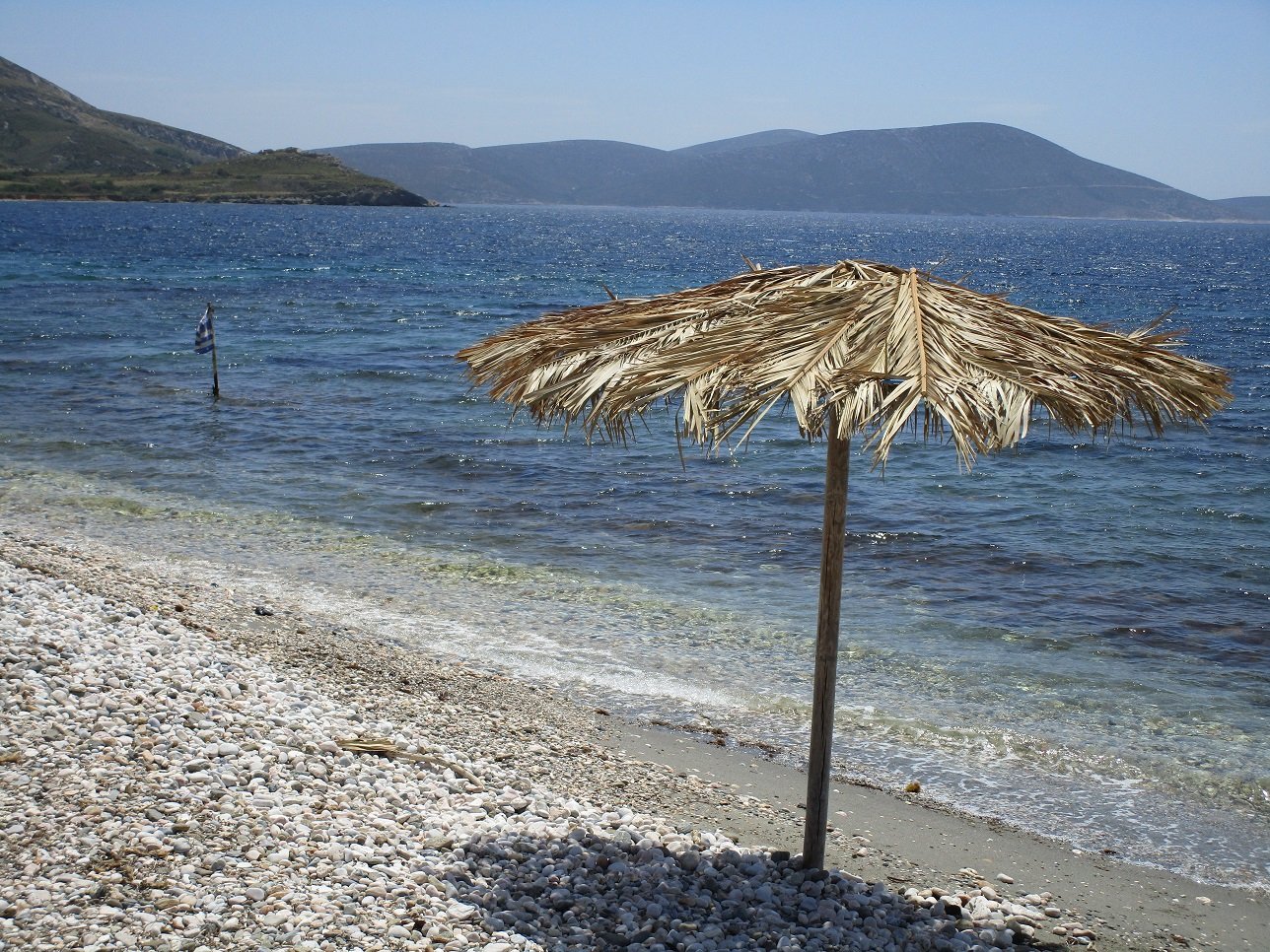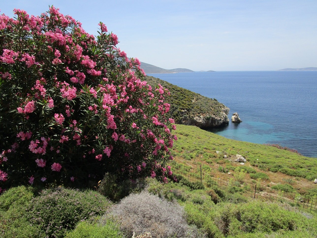 If you take the road south from Kalamitsa into the direction of the grave of Rupert Brooke (which we could not find) and the bay of Tris Boukes, then gradually the nature becames more rugged and you will encounter beautiful landscapes, especially if you keep driving and go into the mountains. Eventually you'll end up at a military base anyway and you will not be able to continue. The bay of Tris Boukies is not accessible and also at Schinochorti on the east side of the island is a military base.