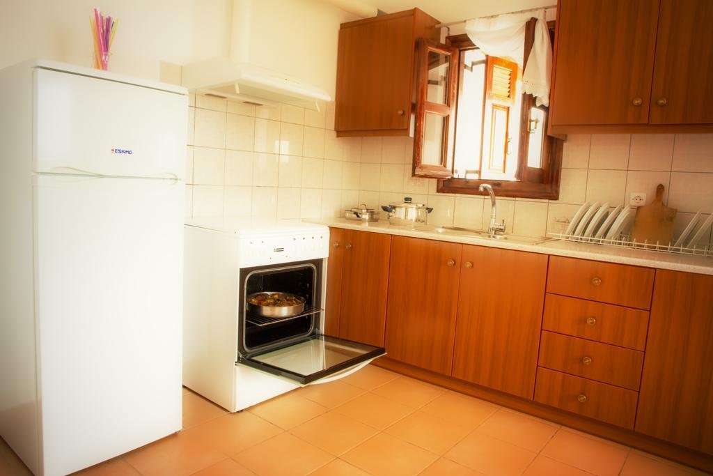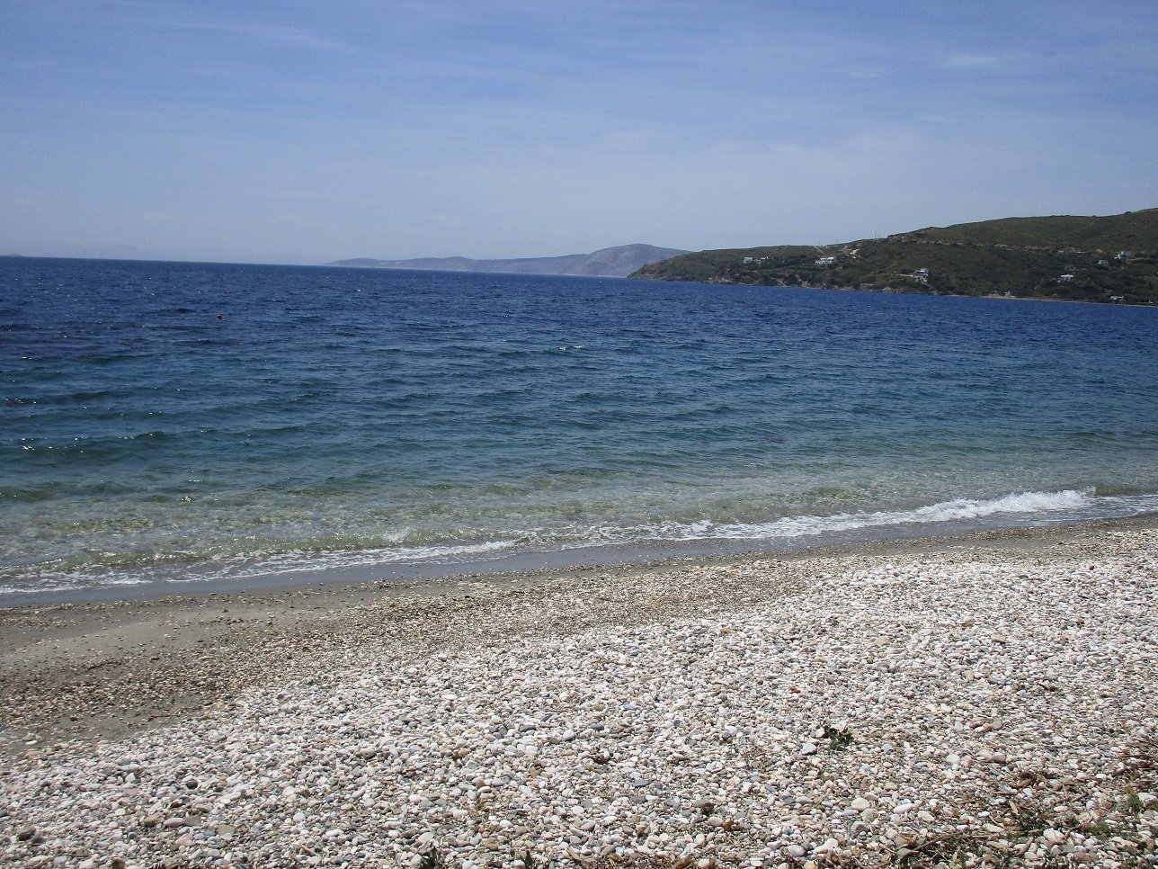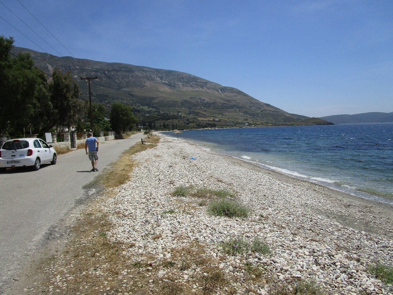 Kalamitsa Beach is situated on the west coast of the island of Skyros, just south of the port of Linaria, and for that reason it can sometimes get a bit busier. It is a long sand and pebble beach that is regularly in the path of the wind and therefore it is popular with windsurfers. The seawater at Kalamitsa beach is very clear. The distance from the beach to the capital Skyros Chora is about ten kilometers. It is an organised beach and there are a number of taverns and cafes, and a surf club (not open yet in May 2018 when we were there, and at that time there were also no sunbeds and umbrellas for rent). Kalamitsa is widely considered the best beach of Skyros (maybe for surfing, but we have seen better beaches such as Magazia, Acherounes, Gyrismata, Kareflou, Limanaki). At the beach of Kalamitsa is the chapel of Agios Mamas, and near are a sarcophagus and a well-preserved column from the Doric time.