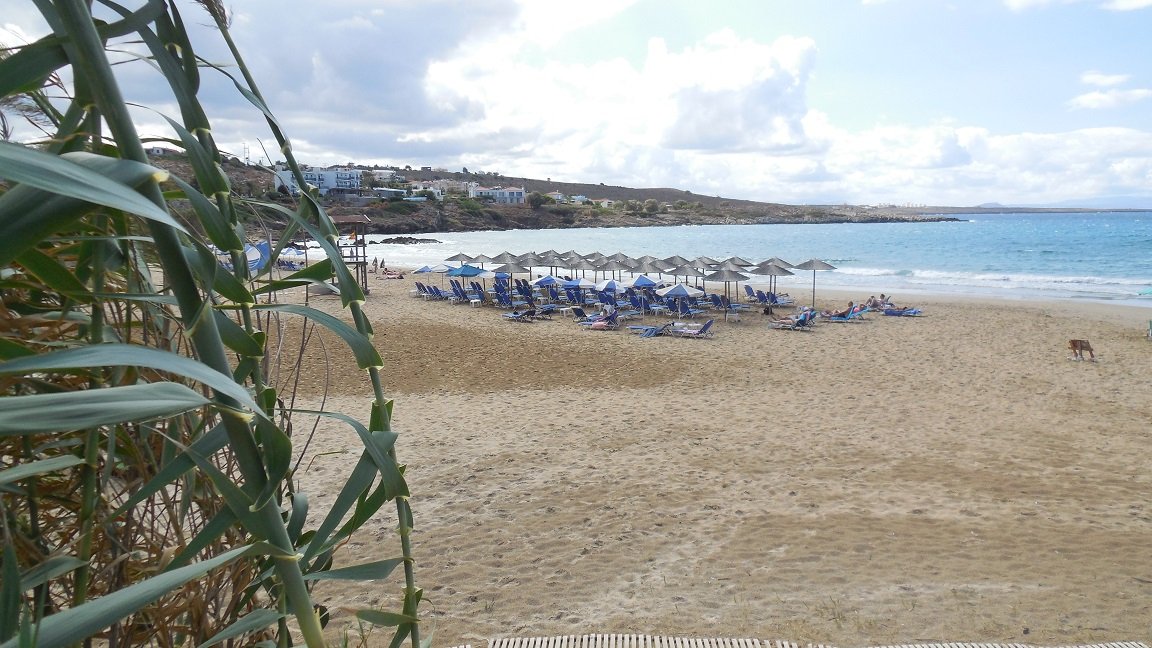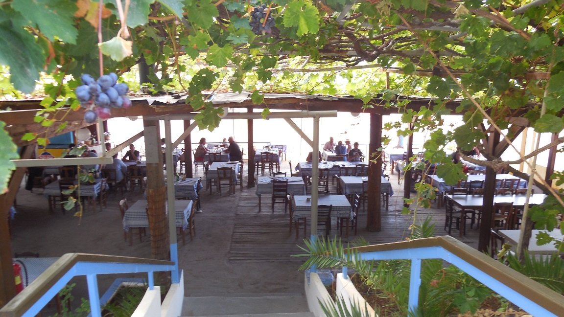 Het Kalathas restaurant ligt aan het strand van Kalathas naast de rivier. We bestellen er een vis, gevulde tomaten, wijn en een tzatziki. De bediening is vriendelijk en alles smaakt prima. De frietjes zijn lekker knapperig. Ons oordeel: een 8,5 uit 10 |