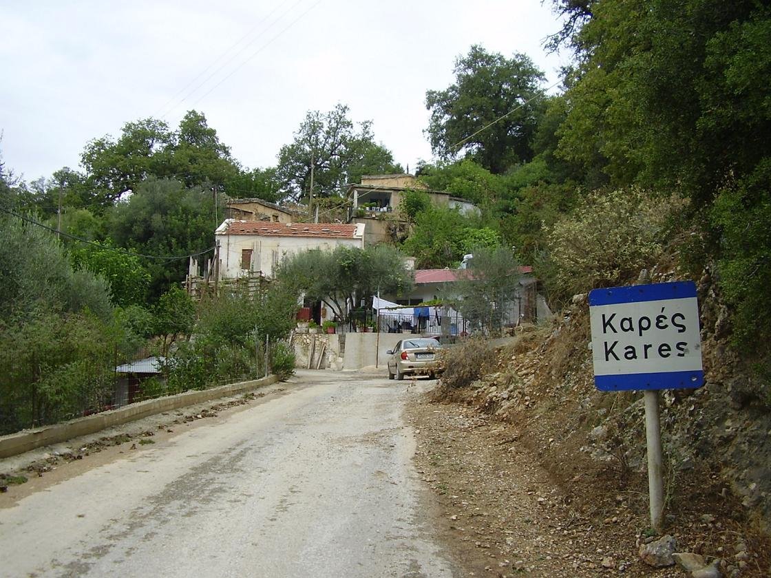 Je kunt je zo maar vergissen als je vanaf de route van Megala Chorafia naar Stylos en Neo Chorio naar het dorp Kares wilt gaan en zo naar Chora Sfakion in het zuiden van Kreta wilt rijden. Neem je de afslag te vroeg (want je ziet de naam "Kares" aangegeven op een bord) dan beland je ook in Kares, maar dat is dan een geheel ander dorp. Het dorp Kares hier is te bereiken via de route Stylos - Provarma - Ramni - Kares en het ligt in de bergen ten zuiden van de Baai van Souda. Het kleine en stille traditionele dorp met zijn kleine huisjes ligt aan het einde van de weg (je denkt misschien dat je nog door kunt rijden maar de weg wordt al snel onprettig). De natuur is hier weelderig en groen en er staan veel grote bomen. In de omgeving zijn veel natuurlijke bronnen. In Kares staan veel oude gebouwen uit de Venetiaanse en Turkse tijd, een paar kerken, de restanten van een Venetiaans fort en er zijn een drietal grotten in de buurt.
