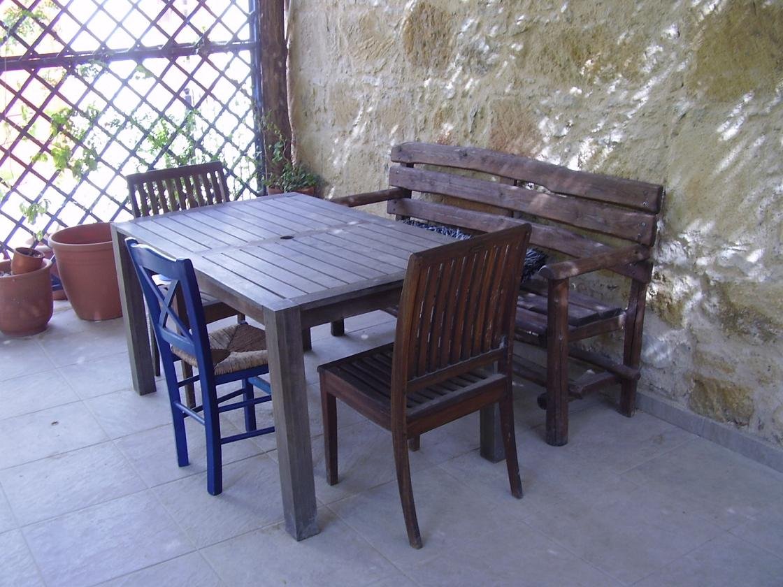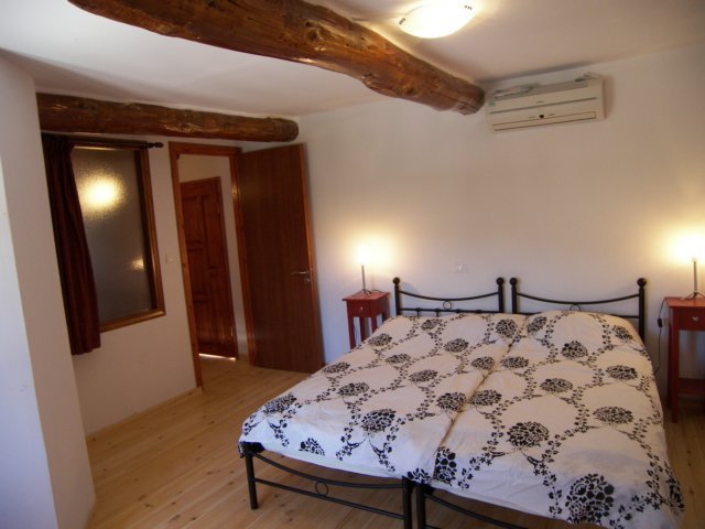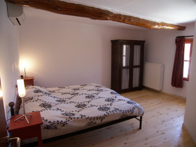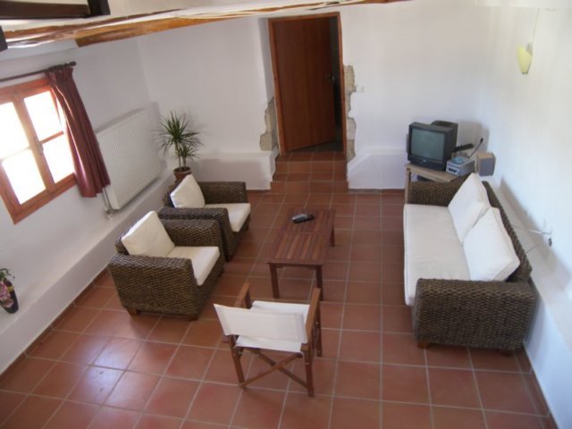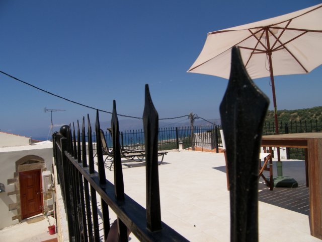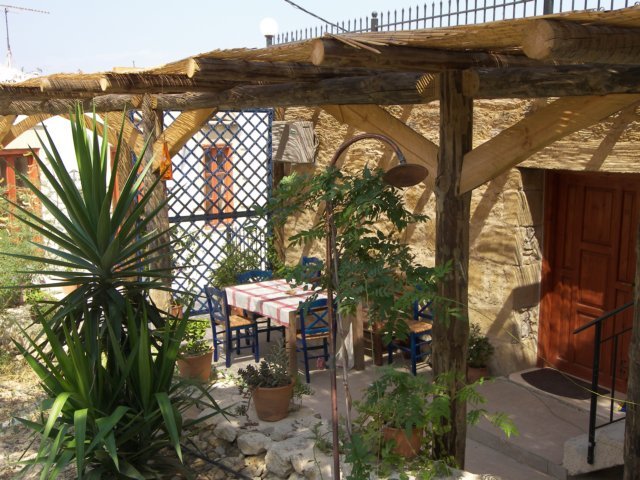 Via a spiral staircase you can reach the second floor where you will find two bedrooms with bathrooms "en suite". They are separated through a small hallway which also gives access to the back terrace and the roof terrace. The back terrace has a pergola that provides ample shade (much needed during summer months). The stone steps on the terrace lead to the roof terrace, which gives splendid views on the bay of Kissamos and the surrounding mountains with olive groves. The terrace is enclosed through flowers and plants which will provide you with privacy. Every terrace is lit by romantic lights so you can sit outside on warm summer nights. |