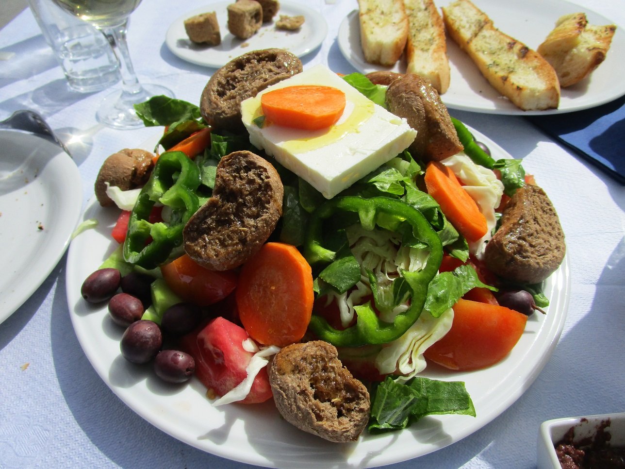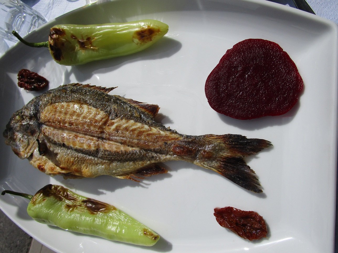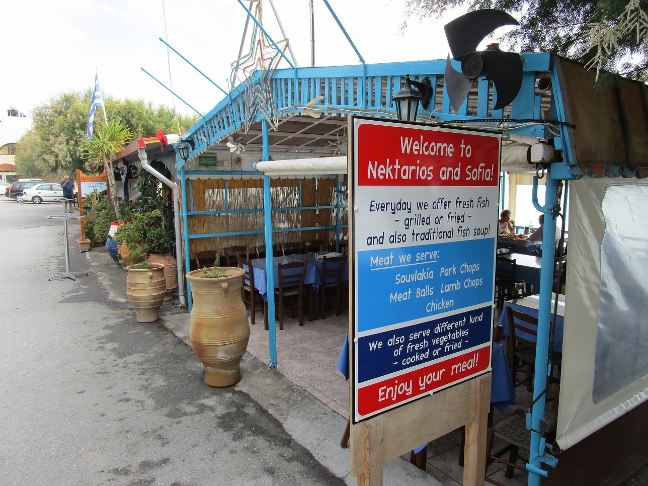 Aan de zee gelegen taverna in het dorp Kastri. We wilden er vissoep eten omdat daarmee werd geadverteerd op de borden, maar die was er niet. Dus bestelden we een vis (dorade), een special omelette, een tzatziki, een Nektarios salade en een halve liter witte wijn. In de special omelette zat ham, feta kaas, bacon en aardappel. In de Nektarios salade zat kool, wortel, komkommer, andijvie, tomaat en feta. Alles prima in orde. Ons oordeel: een 9 uit 10 |