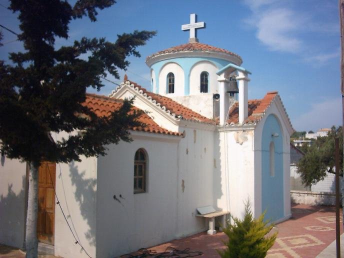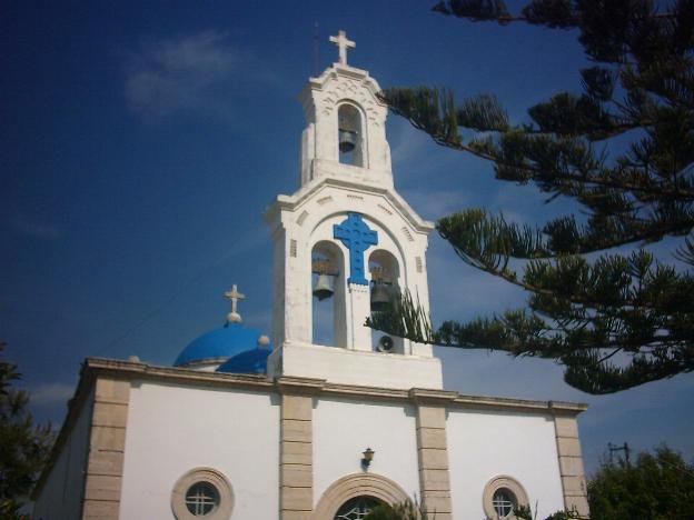 Het verhaal gaat dat deze mooie kerk met zijn blauwe koepels is gebouwd door vijf ongetrouwde zussen en dat elk van hen een van de koepels heeft gebouwd. Een bordje leid je vanaf de hoofdweg een straat in, maar daarna wordt het eindeloos zoeken, want dit is dan ook het enige bordje dat de Grieken hebben neergezet. Het feit dat ik de kerk na tien minuten lopen heb gevonden was dan ook puur geluk. Misschien is het handig om het aan de bewoners van het dorp te vragen als je er bent. Je moet door een aantal straten lopen met vervallen huizen, want de kerk ligt wat buiten het centrum van het dorp. Behave drie Byzantijnse kerken zijn er in het dorp nog een aantal andere mooie kerken. |