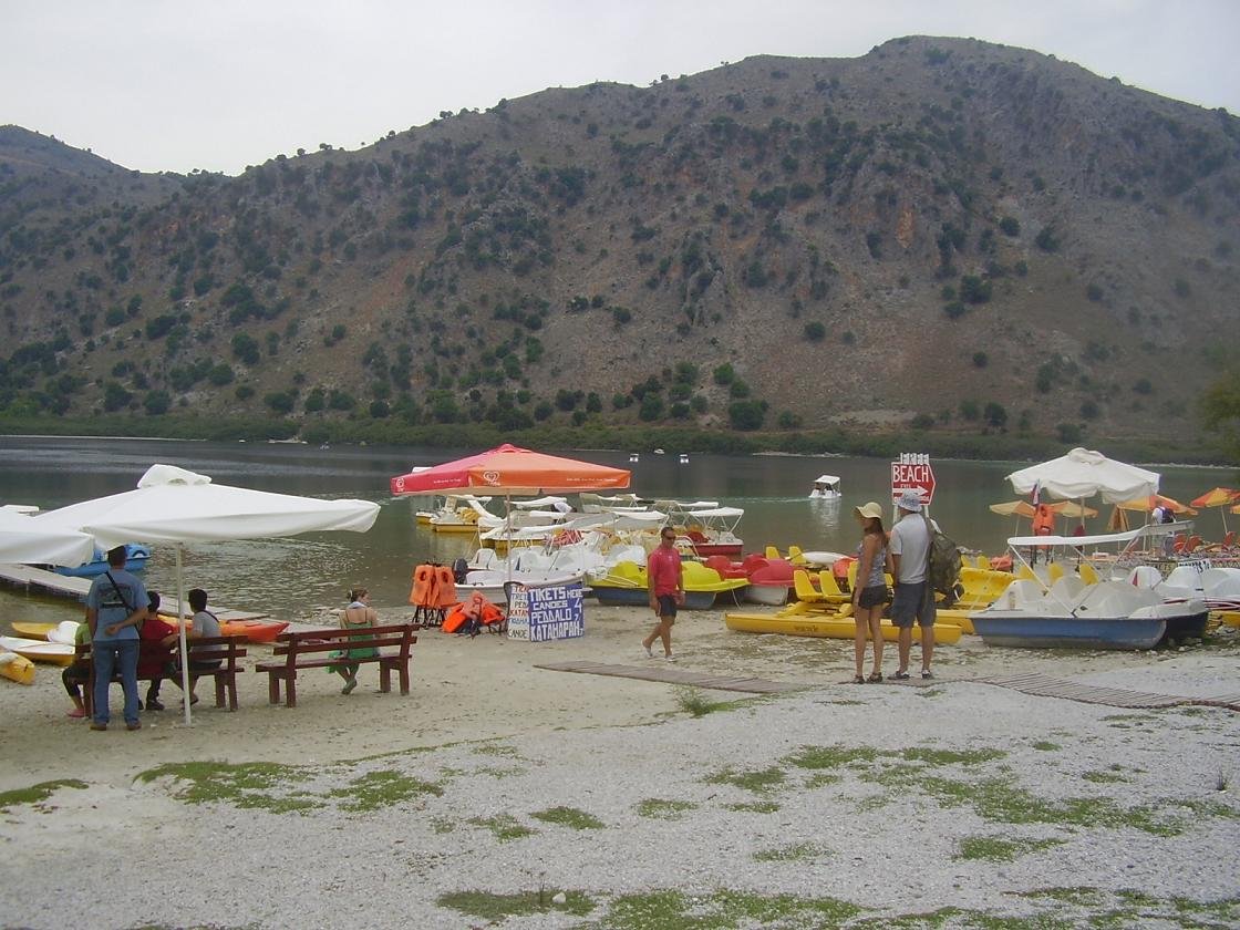 Veel mensen die in het nabijgelegen badplaatsje Georgioupolis als toerist te gast zijn maken er een dagtochtje van om het meer van Kournas te bezoeken. Het is een stevige wandeling van ik meen ongeveer 6 kilometer, waarvan een groot gedeelte de heuvel op. Sinds kort rijdt er ook het speciale toeristen-treintje op en neer tussen Georgioupolis en Lake Kournas en het meer begint een steeds commerci�lere indruk te maken. Vooral het aantal borden en het aantal waterfietsen leek mij veel groter dan een aantal jaren terug. Iedereen probeert een graantje van het succes van Lake Kournas mee te willen pikken. Er zijn een aantal souvenirwinkels en er is een flinke keuze qua taverna's. Ook zijn er ligbedden en parasols verkrijgbaar op de strandjes van Kournas op de goede stukken (andere stukken zijn toch wat meer modder als je er overheen loopt), maar alhoewel je in het meer kunt zwemmen vind ik het zelf niet erg uitnodigend. |