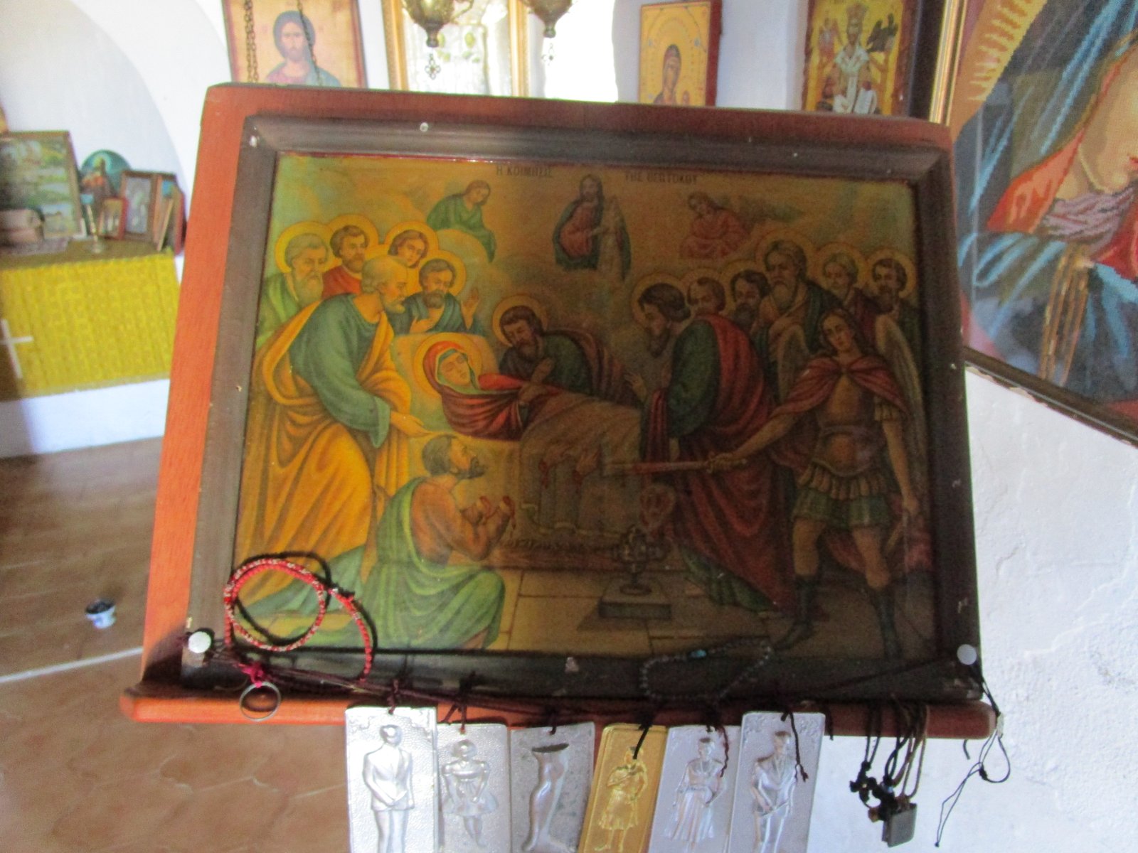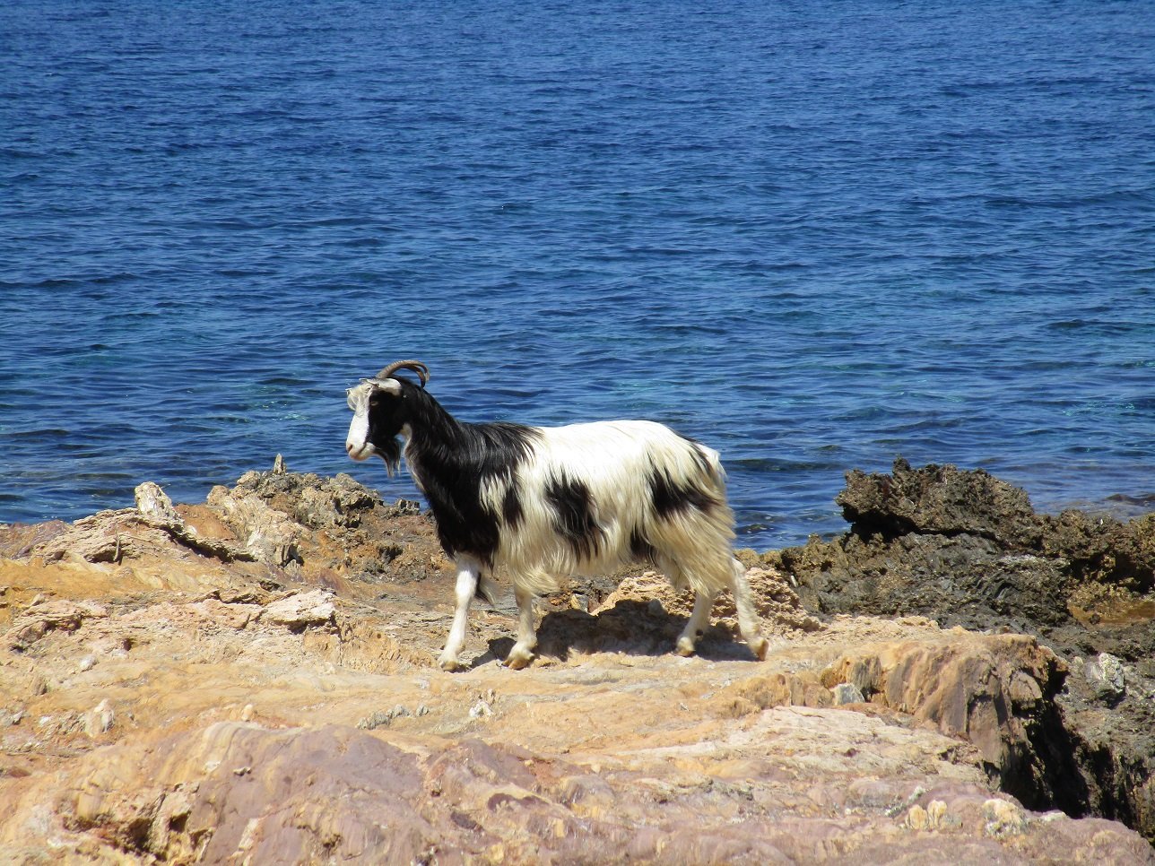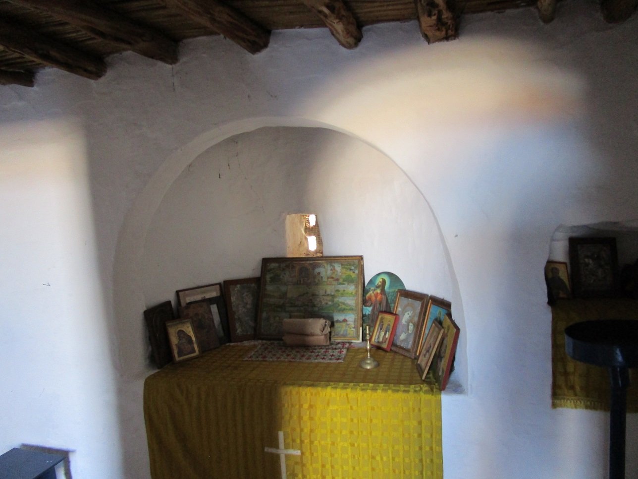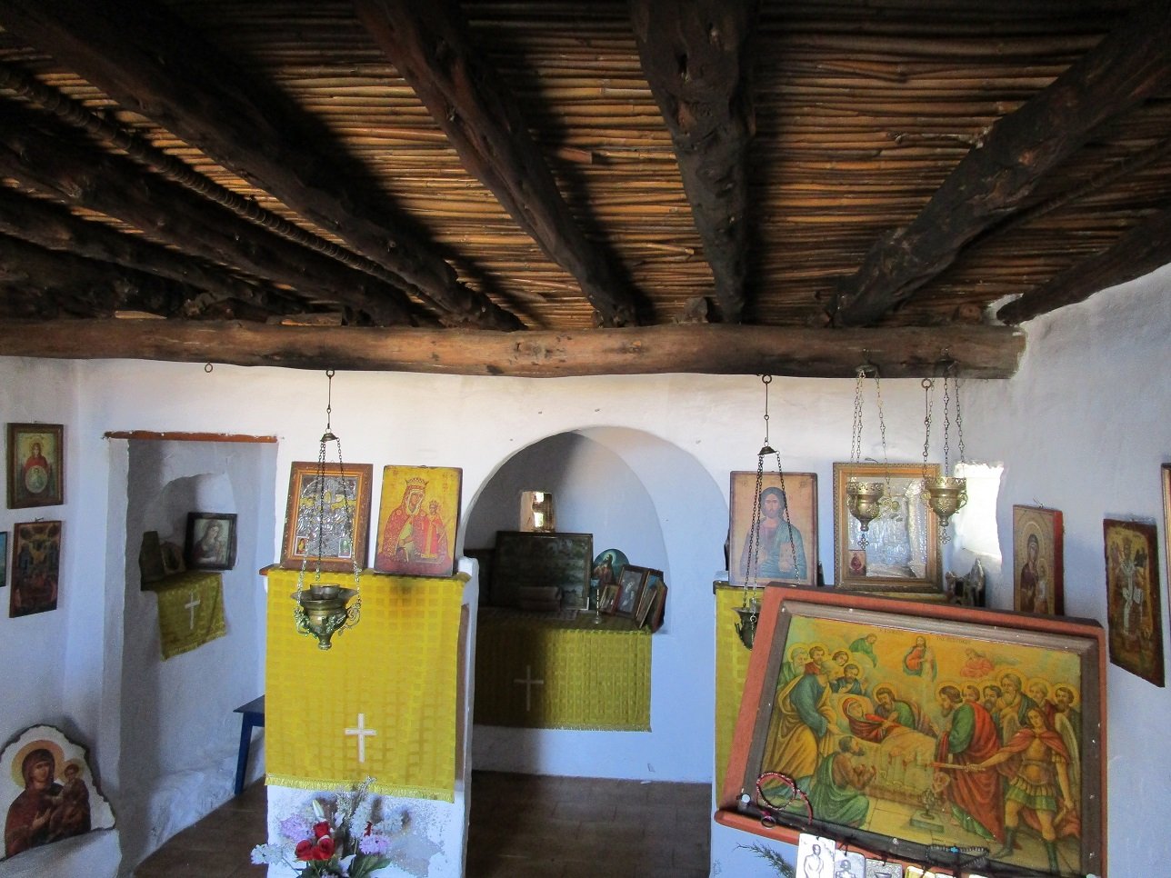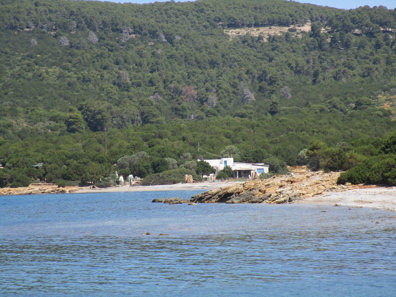 Kyra Panagia Beach is a beautiful sandy beach that lies just above Atsitsa Beach, in the northwest of the island of Skyros (in May 2018 there was still quite a bit of seaweed though because it had not been cleaned yet). It is a quiet beach with no facilities (no umbrellas and sunbeds, no taverns, but in high season you can find a tavern in nearby Kalogria beach). At the beach, which is surrounded by pine trees, there are a few small houses and a small white square church with a blue door and a cross over the entrance. This is the Kyra Panagia church after which the beach was named. There are some icons inside the church and it has its original old wooden ceiling. Outside in front of the church there is an ancient column. The trees that surround the beach of Kyra Panagia provide some shade, but when you visit this beach it is smart to bring some sun block cream and a supply of water.