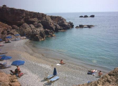 Het dorp Chora Sfakion is gelegen in het zuiden van Kreta op een afstand van 60 kilometer ten zuiden van Chania. Het dorp telt ongeveer 400 tot 500 inwoners, maar het was ooit veel groter. Er is een strand in het dorp en er is nog een strand aan de rand van het dorp waar je parasols en ligstoelen kunt huren. Aan de westzijde van het dorp kan je ook een wandeling maken naar meer rustige stranden, die je na een minuut of 30 tot 60 bereikt. De weg na Chora Sfakion wordt erg steil en bochtig. Na 2 kilometer is er een kleine inham met een strand en een taverna (Illingas Beach). Er zijn ook taxi-bootjes naar het prachtige naturistenstrand Sweet Water Beach, Marmara Beach, Loutro, Agia Roumeli of zelfs naar het eiland Gavdos. Naar Sweet water Beach kun je ook lopen vanaf de weg en dan via een pad langs de kust (volgens mij geen goed plan voor mensen met hoogtevrees zoals ikzelf). Aan de andere kant van Chora Sfakion ligt trouwens het enige echt officiële naaktstrand van het eiland Kreta (Filaki Beach). Voor meer informatie over het dorp, de accommodaties en foto's van Chora Sfakion - klik hier. Nog een ander aardig dorpje in het zuiden van Kreta met een (gedeelte) naakstrand is Sougia. |
