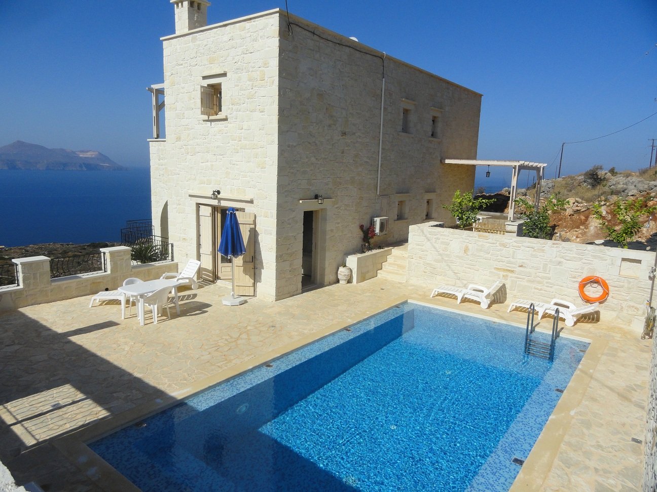 Villa Azure is geschikt voor maximaal 10 mensen en het is waarschijnlijk een van de meest privé gelegen villa's in het Apokoronas gebied. Je hebt er geen directe buren en het is heerlijk rustig: geen mensen, geen blaffende honden en geen verkeer. Door de ligging op de heuvel en de bomen die er voor de villa staan is er eigenlijk geen inkijk, dus het is ook geschikt voor mensen die liever het zwembad ingaan zonder badkleding. Villa Azure is een prachtige grote villa van ongeveer 250m2 waar je helemaal kunt ontspannen, naar de vogeltjes kunt luisteren, naar de voorbijvarende boten in de baai van Souda kunt kijken of van de zonsondergang kunt genieten met een glaasje wijn in je hand.