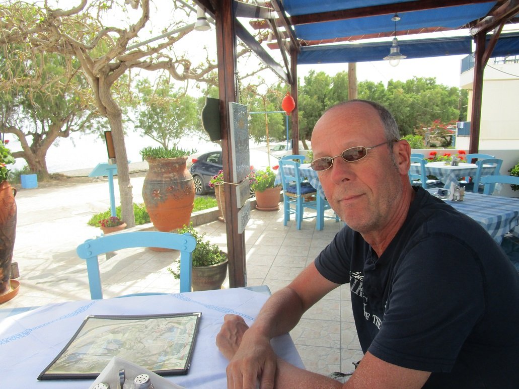 Deze taverna zit direct naast de grote parkeerplaats in het dorp Makrigialos, aan de linker kant als je richting de zee staat. Er is geen uitgebreide kaart maar het is er wel spotgoedkoop en lekker. Wij bestellen er de fried courgettes, tzatziki, twee maal de sole fish, een mix fish, chicken filet en green beans. Dat alles natuurlijk vergezeld van een karaf witte wijn. |