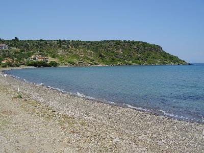 Vlakbij Skala Neon Kydonion is de Maragos Kaap en zijn strand. Op het strand is een hele grote taverna, maar die was in mei gesloten. Veel zeewier zowel op het strand als in de zee. |