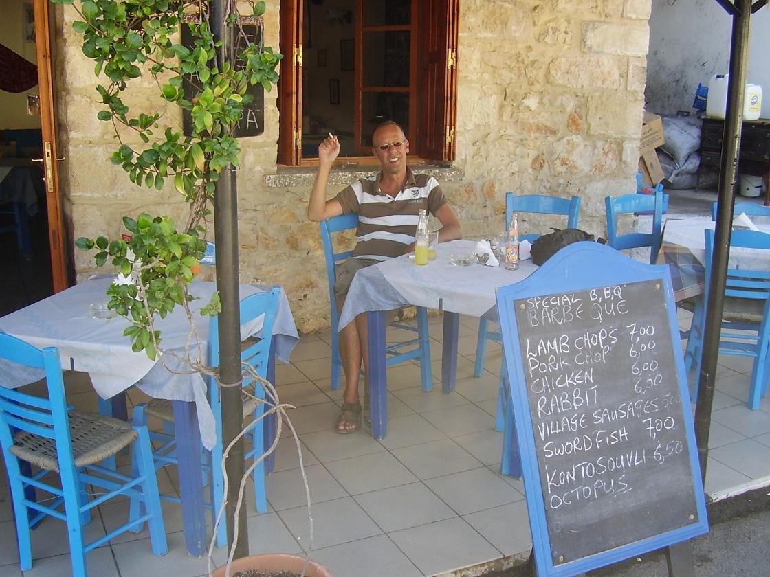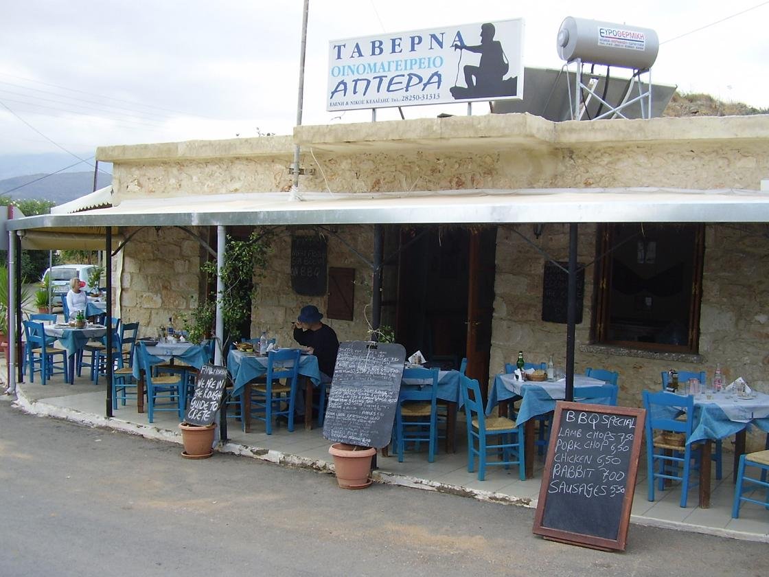 Eigenlijk hebben we hier alleen maar een frisdrankje genomen maar de mensen die hier werkten waren zo vreselijk aardig dat ze toch wel een eervolle vermelding verdienen. We vroegen de weg aan ze naar onze volgende accommodatie en voordat we het wisten waren ze op eigen kosten aan het bellen met de eigenaars voor de uitleg hoe er te komen. Het was er ook erg gezellig. De taverna ligt op het kruispunt bij Megala Chorafia (alhoewel er Aptera op het naambordje staat - hierna snapten wij er dus ook niets meer van want we vroegen naar Megala Chorafia maar we bleken er te staan). Afijn, geen oordeel over het eten dus maar als die net zo geweldig is als de hartelijkheid van deze mensen dan is het een dikke tien. Okay, in 2010 hebben we dus deze taverne getest. Ze serveren diverse soorten ontbijt, diverse voorgerechten (vegetarisch en niet-vegetarisch), diverse salades,vlees en kip van de grill, diverse kaassoorten, ijs en zoetigheden. Wij probeerden de gevulde courgette-bloemen (zuchini flowers) met f�ta, de kaas saganaki, briam (verschillende soorten groenten en f�ta uit de oven) en de tonijnsalade. Het eten kwam er vrij snel aan en de bediening was vriendelijk. Het brood kwam in ��n stuk en was vers. De schotels zagen er wel een beetje rommelig uit: alsof er niet veel zorg aan was besteed. In de tonijnsalade zaten grove stukken rauwkost en in eerste instantie zag je de tonijn en de eieren niet eens die er in hoorden te zitten. Ze lagen helemaal onderop. De presentatie kan beter hier. Er zat een lente-uitje door, tomaat, paprika, sla, olijven, tonijn en ei. De kaas saganaki was hier 10 keer beter als aan de overkant bij de Cretan Corner. Ook de briam smaakte goed. Het afrekenen duurde even want de eigenaresse was zwaar in gesprek met een vriendin en keek niet meer op of om. Wij voelden ons onzichtbaar. Ons oordeel: redelijk en iets beter dan bij de Cretan Corner, een 7,5 uit 10 |