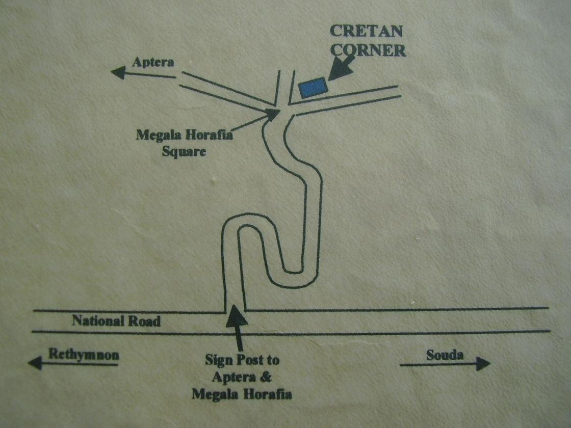 De Cretan Corner Taverna zit op de splitsing in Megala Chorafia (waar je ook af kunt slaan naar de opgravingen van Aptera). Hier op deze splitsing zitten eigenlijk alle eetgelegenheden bij elkaar. De Cretan Corner is de grootste van de drie taverns in Megala Chorafia en heeft ook het mooiste uitzicht. Ze verkopen er diverse soorten ontbijt, vegetarische voorgerechten, andere voorgerechten met vlees en vis, salades, gegrild vlees en kip, omelettes en nog meer. Wij probeerdeb de spinazie-taartjes, de kaas saganaki, de frietjes, de tonijnsalade en de tzatziki. Het brood was in ��n stuk en was vers. De tzatziki had wat meer komkommer en knoflook kunnen gebruiken. Hij was wat waterig. De spinazie-taartjes waren lekker maar volgens ons gewoon van een pak uit de diepvries. De tonijnsalade was met andijvie, tomaten, ui, olijven en tonijn. De frietjes waren redelijk knapperig maar de kaas saganaki was uitgedroogd en leek meer op een stuk rubber: echt vies. Cretan Corner is wel een goedkope taverne. Ons oordeel: redelijk, sommige dingen waren goed, andere gerechten ronduit slecht, een 7 uit 10 |