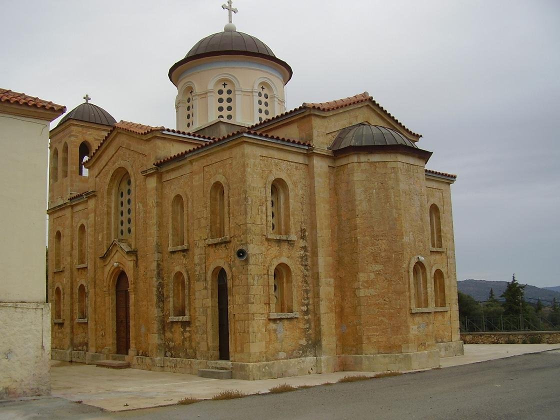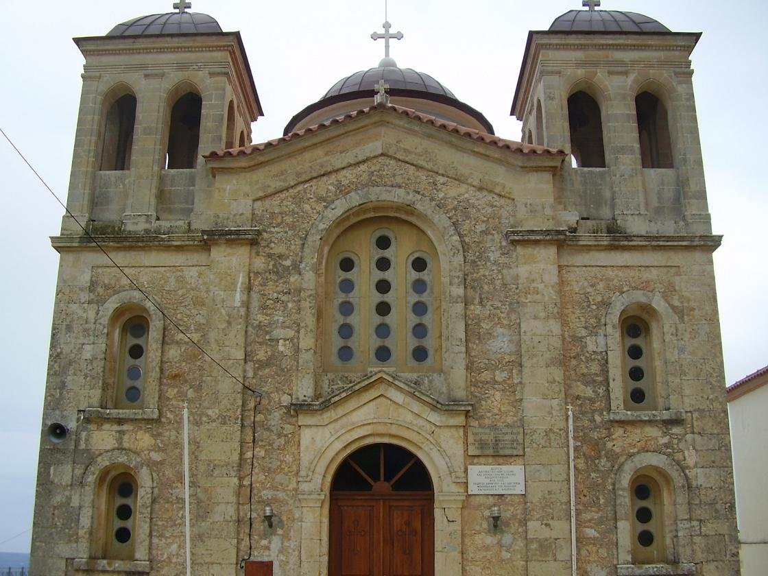 De grote opvallende kerk van het dorp met zijn koepel en twee torens is echt prachtig. Hij lijkt wel van een soort zandsteen gemaakt te zijn. Vanaf het plein dat om de kerk heenloopt heb je schitterend uitzicht over de Apokoronas en de baai van Souda.