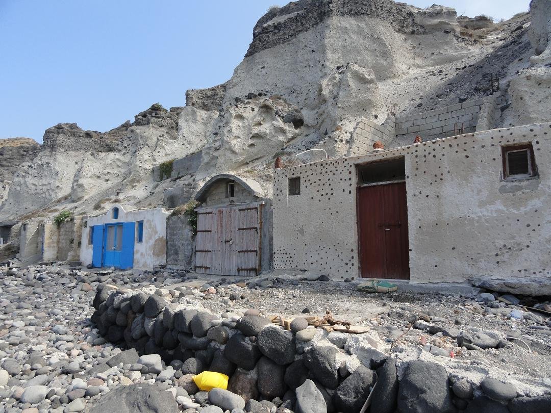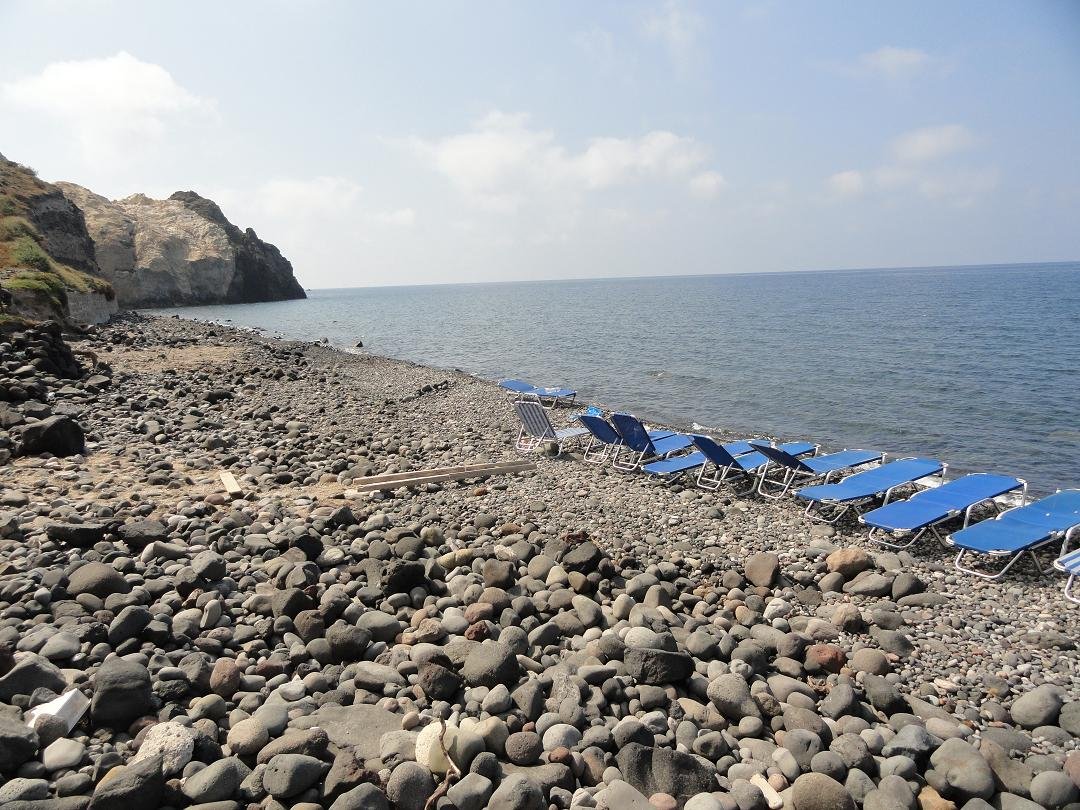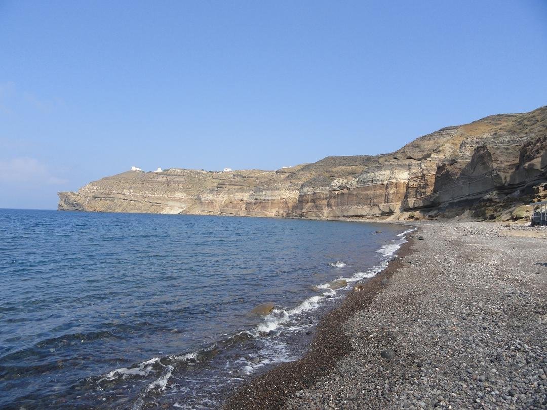 - Mesa Pigadia Beach - Dit strand ligt in het zuidwesten van het eiland op een zijtak van de hoofdweg naar Akrotiri, vlakbij de vuurtoren. Het is te bereiken over een weggetjes (niet geasfalteerd). Je kunt er naartoe lopen maar het is ook mogelijk om er met een goede auto of bijvoorbeeld een quad te komen. De afstand vanaf de hoofdweg is ongeveer een kilometer. Het is hier iets rustiger dan op sommige andere stranden op Santorini omdat het wat meer buiten de route ligt. Het niet al te grote strand bestaat uit zand met (voornamelijk) keitjes maar heeft ook grotere stenen erop en het wordt omgeven door hoge witte kliffen. Er zijn een paar grot-huizen waar gedurende de winter wel eens vissersboten in worden gestald en wat "syrmata", huisjes die geheel of gedeeltelijk in de rotsen zijn uitgehakt. Je kunt ook naar het Mesa Pigadia strand varen met een excursie-bootje vanuit Akrotiri.