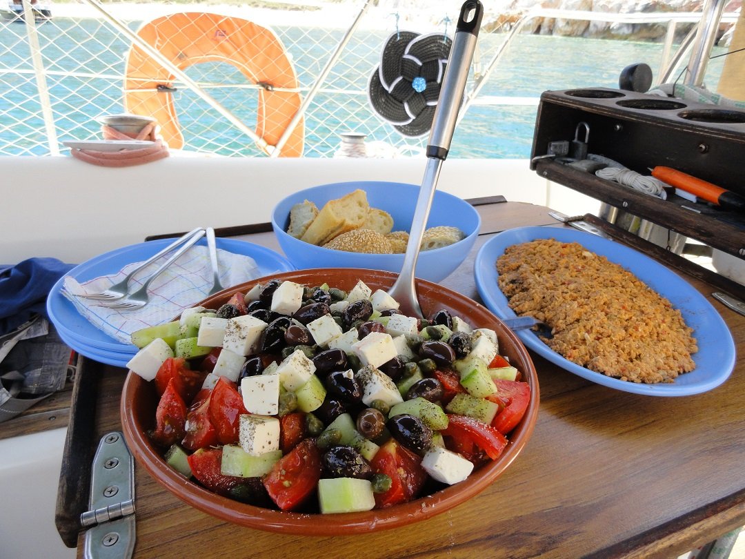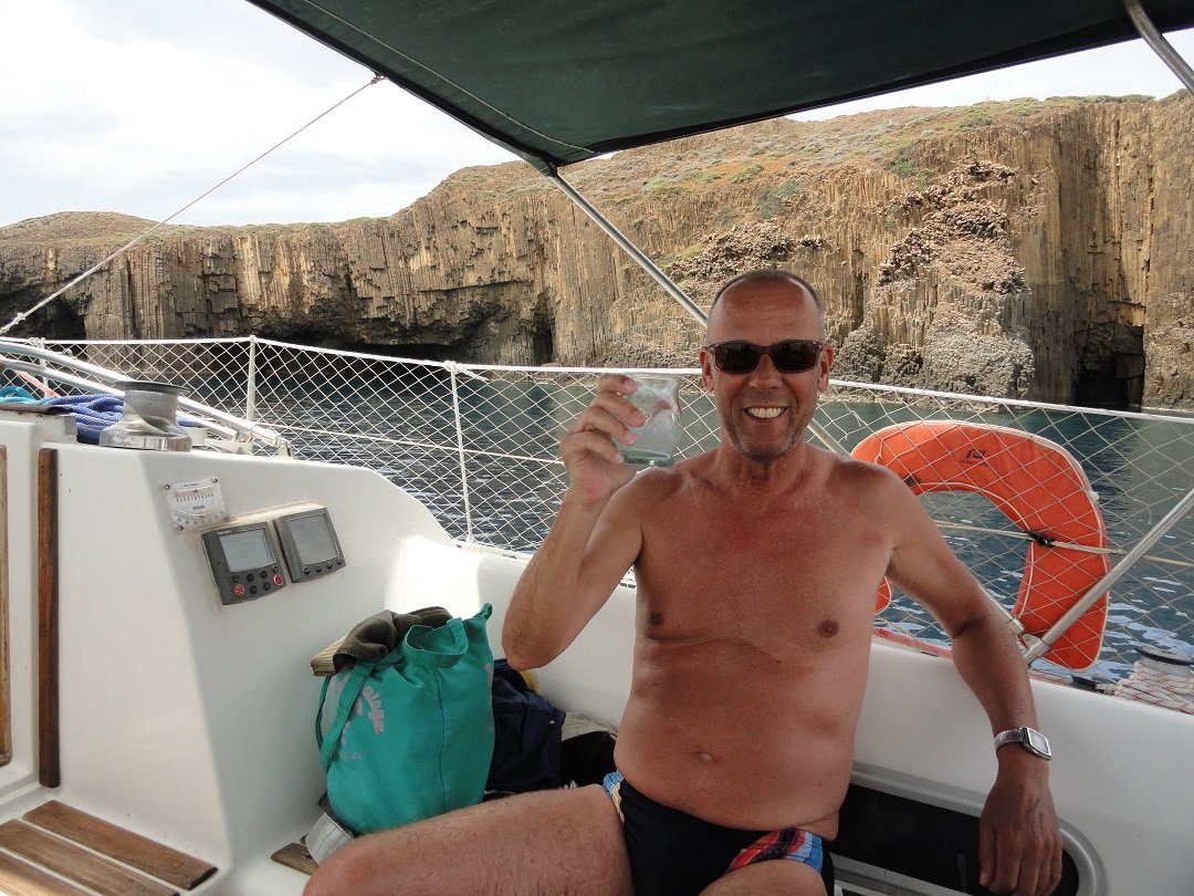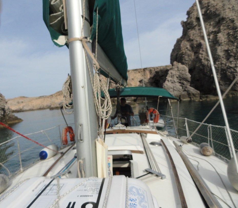 Wij maken een stop bij een van die strandjes aan de oostelijke zijde van Polyaigos en zwemmen er naartoe vanaf de zeilboot, terwijl kapitein Petros de maaltijd gaat maken. Het is een vrij groot kiezelstrand met mooie witte, maar ook veel leuke gekeurde keitjes. Het water is helder en weer turqoise en het strand is schoon. Er is ook een pad dat leidt naar een boven het strand gelegen vuurtoren. Opvallend zijn ook de vreemd gevormde rotsen die vanuit het landschap als punten uit de grond komen zetten. Na een half uurtje "vrij" zwemmen we weer terug naar de boot. Er kan weer een nieuw eiland "bijgeschreven" worden waar we voet aan wal hebben gezet. Petros heeft wat lekkers voor ons klaargemaakt en we genieten van het eten, met een koud wit wijntje erbij. |