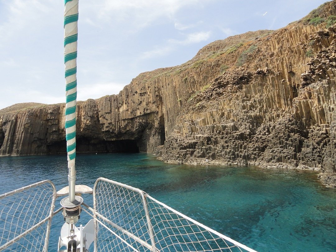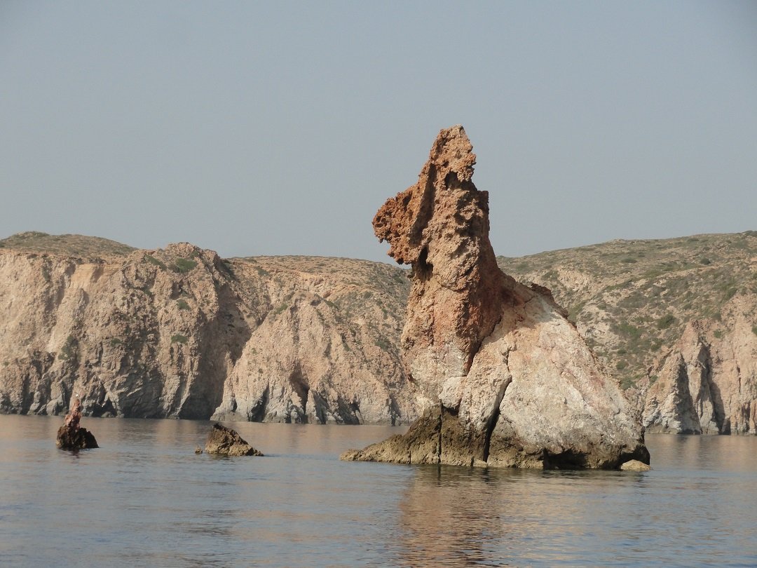 Vanaf de Blue Bay voeren we verder langs de kust waar even verderop een stel prachtige puntige rotsen uit de zee komen zetten. Onderweg komen we ook nog de restanten van een oude gebouwtje tegen dat ooit werd gebruikt in de tijd dat er nog een mijn op het eiland was (nu verboden). De rotsen steken als majestueus als een soort kasteeltorens uit de zee en we varen en vlak langs. Het lijkt bijna of we op een andere planeet zijn beland of in een science fiction film. We zijn nu aan de zuidkant van het eiland en gaan rondom Polyaigos verder naar de oostkant. |