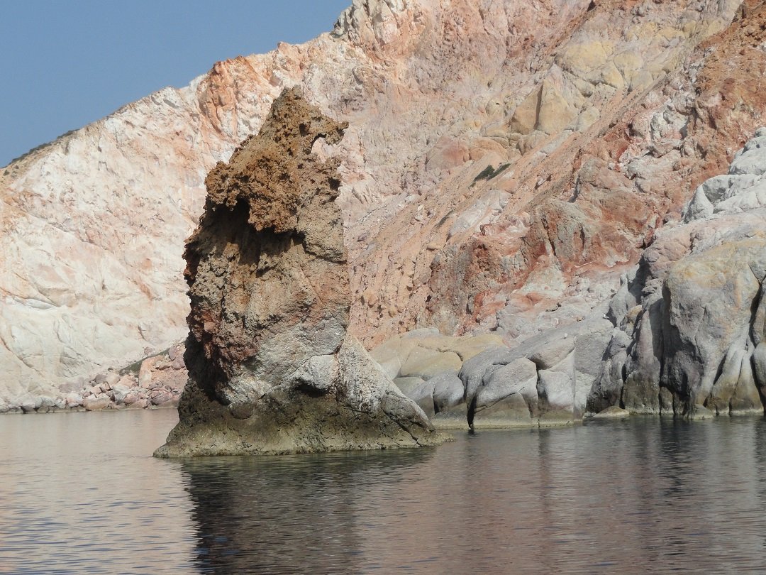 Als we uit zijn gegeten gaat de boottocht verder langs de kust van Polyaigos en we varen onder een boog door in een wat lijkt (of is) een ingestorte grot. De kleur van het water wordt ondertussen voorspelbaar maar het is inderdaad weer turqoise. We gaan verder langs de noordkant van het eiland Kimolos en varen dan rond dat eiland via de westkant weer naar Milos. Het verschil met Polyaigos is toch wel extreem. Niet dat Kimolos niet charmant is, maar de kustlijn mist de prachtige kleuren die we op Polyaigos de hele tijd tegenkwamen. Ook het water is er niet zo prachtig blauw als wat we de hele tijd hebben gezien. De westkant van Kimolos maakt ook een verlaten indruk. Er zijn wat mooie rotsen in de zee en we zien wat strandjes, maar huizen zijn er eigenlijk nauwelijks aan deze kant van het eiland. Weer bij het eiland Milos aangekomen varen we eerst nog langs een aantal bijzondere rotsen die de zee uit komen zetten. Het water hier is groenblauw en mooi helder. |