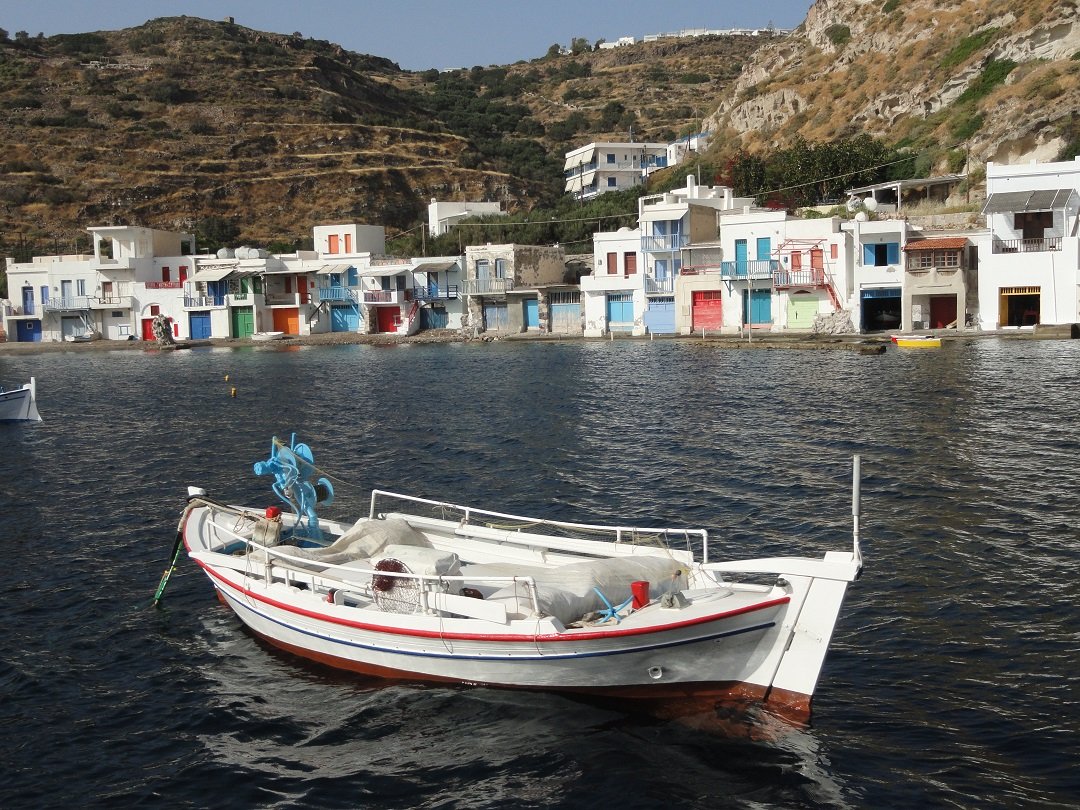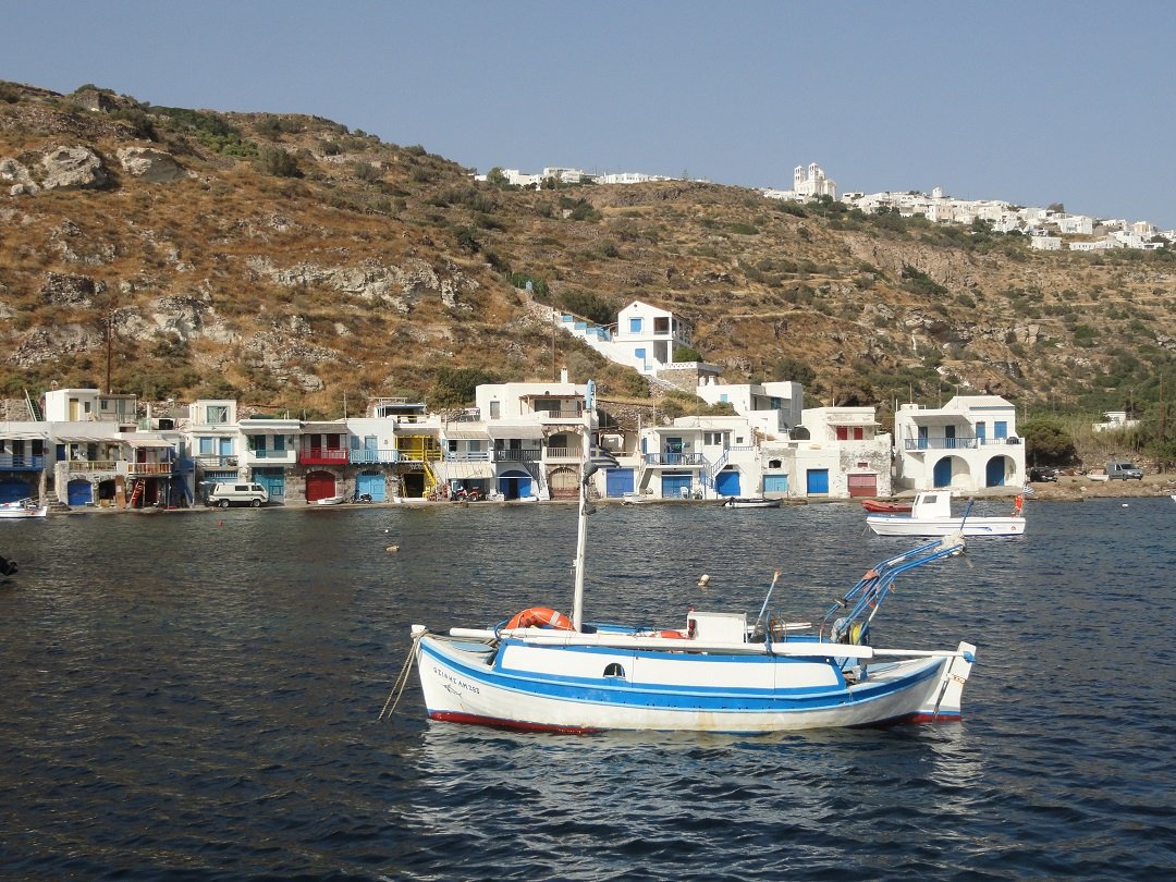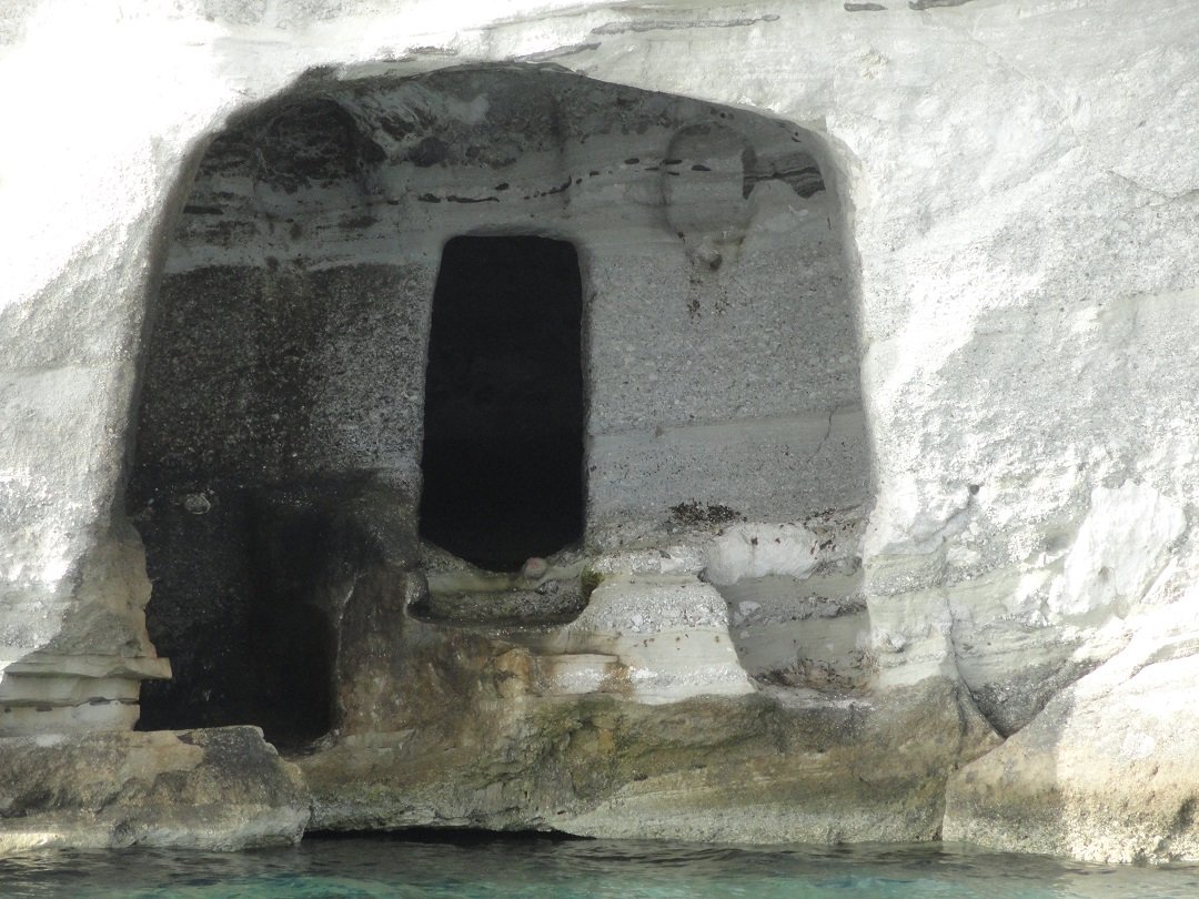 We varen de grote baai in waar ook het havenstadje Adamas ligt. Eerst maken we nog een stop en varen rond een aantal gekke rotsen. Een ervan lijkt op een beer en als je verder doorvaart en terugkijkt lijkt dezelfde rots op een konijn. Met wat meer fantasie kun je in andere rosten weer andere dingen zien. We gaan door langs de kust en zien diverse dorpen met "syrma". Dit waren van origine in de rotsen uitgehakte opbergplaatsen waar na het einde van de zomer de vissersboten werden opgeborgen. Na de Tweede Wereldoorlog begonnen de mensen er een verdieping op te zetten en ze te gebruiken als vakantiehuisjes. Nadat de kapitein zijn boot had geverfd had hij meestal nog een hoop verf over en daarmee schilderde hij dan zijn huis. Vandaar dat alle huizen in deze dorpjes een andere kleur hebben, wat het extra feestelijk maakt. Het laatste dorp met syrma waar we langsvaren is tevens het mooiste. Het is de voormalige hoofdstad van het eiland, Klima. Direkt naast het dorp zijn in de rotsen de uitgehakte catacomben te zien die zijn gemaakt in de Romeinse tijd (1ste eeuw na Christus). Ooit is men hier begonnen met de eerste catacomben en later is men doorgegaan even boven Klima waar zich nu het op een na grootste complex van catacomben op de wereld bevindt (zie de pagina bezienswaardigheden). Dat was het verhaal van onze dag op de Kirki boot. Om 7 uur in de avond waren we weer terug en we hadden echt een bijzondere dag gehad. Misschien leuk om ooit nog eens een andere tocht met kapitein Petros te maken..... |