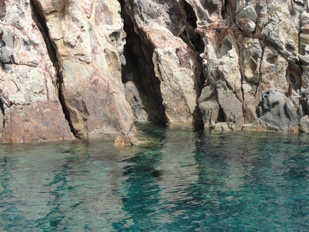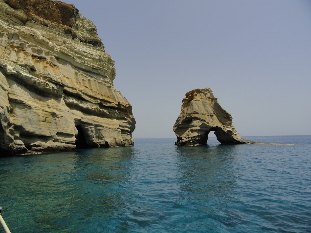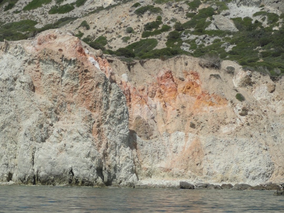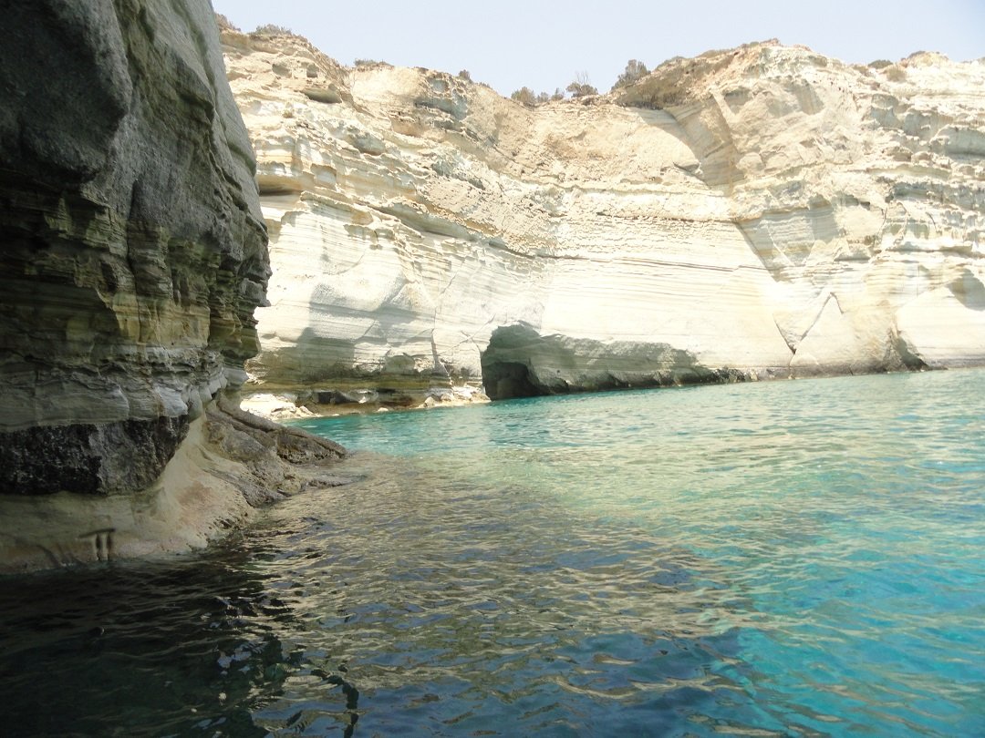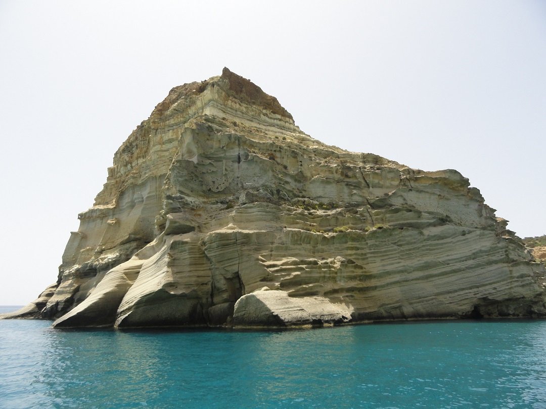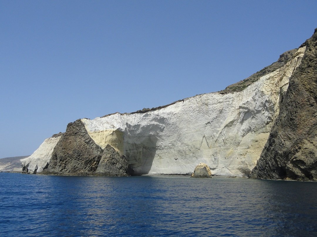 Een excursie met de boot vanaf de haven van Adamas is een echte aanrader. Je kunt met een catamaran (met veel mensen) of met een zeilboot (normaal gesproken maximaal 10 personen) en de drankjes en het eten is inbegrepen. Wij hebben in 2013 zo'n tochtje gemaakt met de Oneiro. De kosten waren 50 euro en dat is het echt waard. Er was een kapitein en een kok aan boord. De kapitein gaf een hele leuke uitleg en was heel enthousiast. Wij begrepen later van andere mensen dat hij de leukste tours had, dus misschien wil je die naam onthouden: Oneiro. Het is een van de eerste boten in het haventje van Adamas. Nadat we de grote baai zijn uitgevaren waar Adamas ligt gaat de boot westwaards langs de kust. De eerste grote bezienswaardigheid is Kaap Vani in het noorwesten van Milos, waar de restanten van een oude mijn zijn te zien. Bijzonder is de grote rots die hier bijna loodrecht de zee uit komt zetten en die 90 meter hoog is. We varen er in alle rust langs zodat je hem goed kunt bekijken. Opvallend is het prachtige turquoise water dat je op Milos op zoveel plekken tegekomt. |