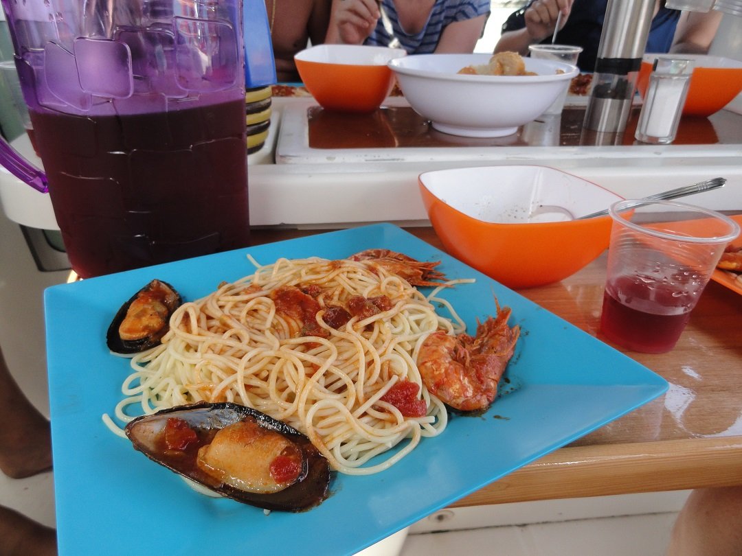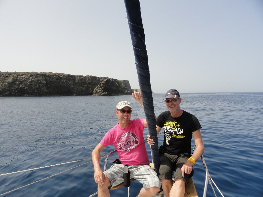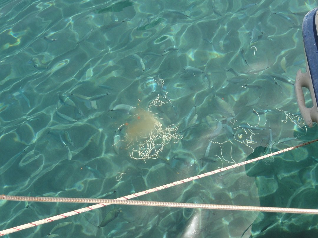 Met de kleine rubberen boot maakten we een rondvaart door het gebied, onder de bogen door, rond de rotsformaties en de grotten en kanalen in. Daarna kregen we de tijd om in de zee bij Kleftiko rond te zwemmen. Er waren snorkels en duikbrillen aan boord voor degenen die alles onder het water beter wilden bekijken. Terwijl wij aan het zwemmen waren, was aan boord de kok bezig met het bereiden van de maaltijd: een spaghetti met mosselen en garnalen en een Griekse salade met een wijntje: erg goed. Degenen die wat spaghetti overhadden konden dat aan de vissen voeren die er in grote getale op afkwamen. |