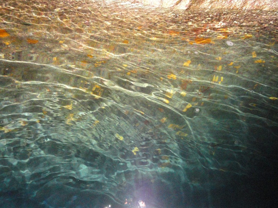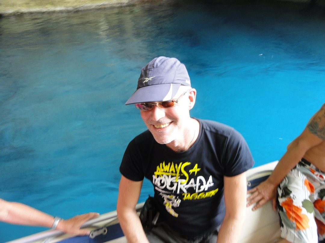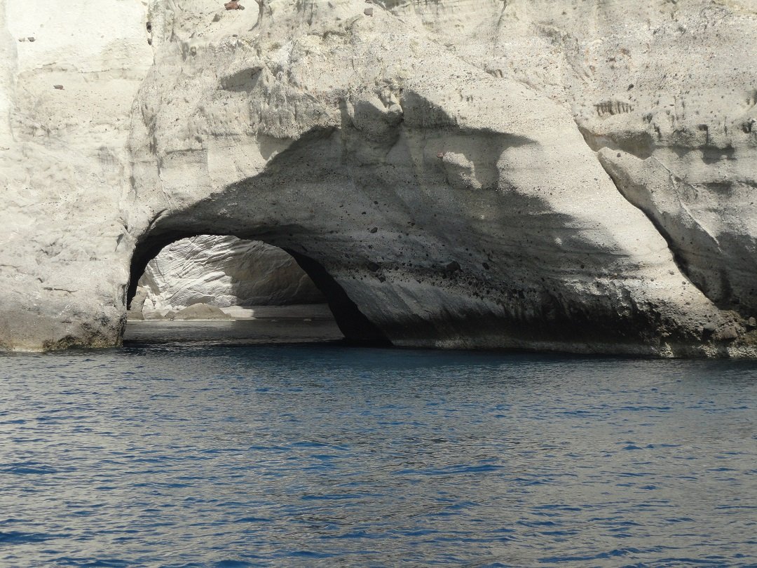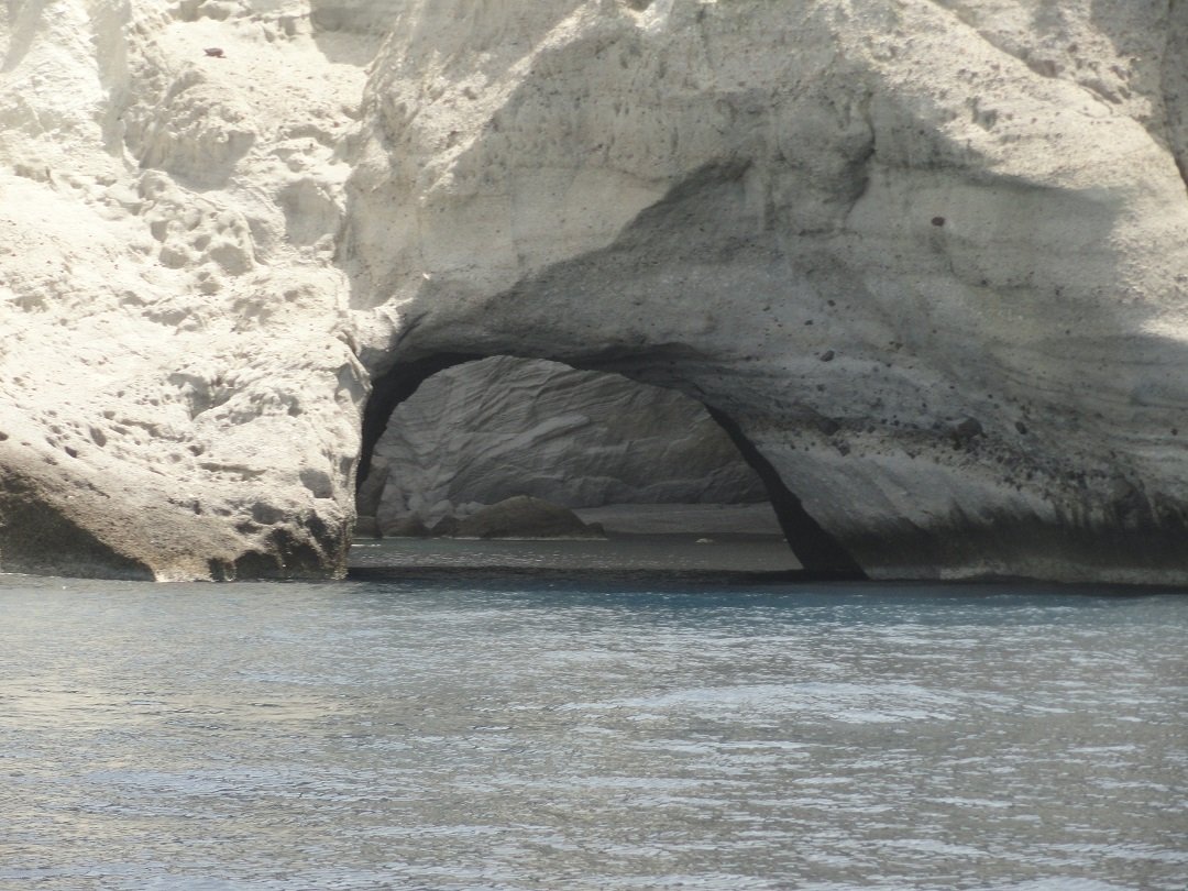 De volgende stop is Sykia Cave in het zuidwesten van het eiland Milos. Vanwege de kleur van het water wordt het ook wel de Smaragden Grot genoemd. Het strand is alleen per boot (priv�- of excursieboot) te bereiken. Sykia Cave is een grot waarvan het plafond is ingestort en waar je met een kleine boot onder een boog door in kunt varen. Het is er werkelijk prachtig. Het witte kiezelstrand is omgeven door hoge witte rotsen. wij maken hier een stop en stappen over in een kleiner rubberen bootje om zo de grot in te kunnen varen. Het is hier heerlijk zwemmen en het water is mooi helder. |