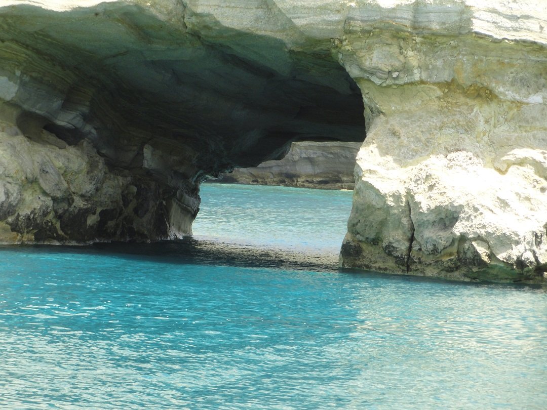 Na de Sykia Cave varen we de hoek van het eiland om naar Kleftiko, dat ook in het zuidwesten van het eiland is gelegen. Kleftiko bestaat uit een aantal mooie witte rotsformaties en bogen in de zee en diverse grotten in prachtig blauw water, waar heel veel vissen in rondzwemmen. In de grotten zijn bijzondere rode sponzen te zien. Kleftiko was vroeger het gebied van de piraten. In een soort van kanaal waar de boten verborgen waren kun je nog zien dat ze op sommige plekken een soort kogelvormen hebben uitgehakt waar ze de boten aan vast konden leggen. |
