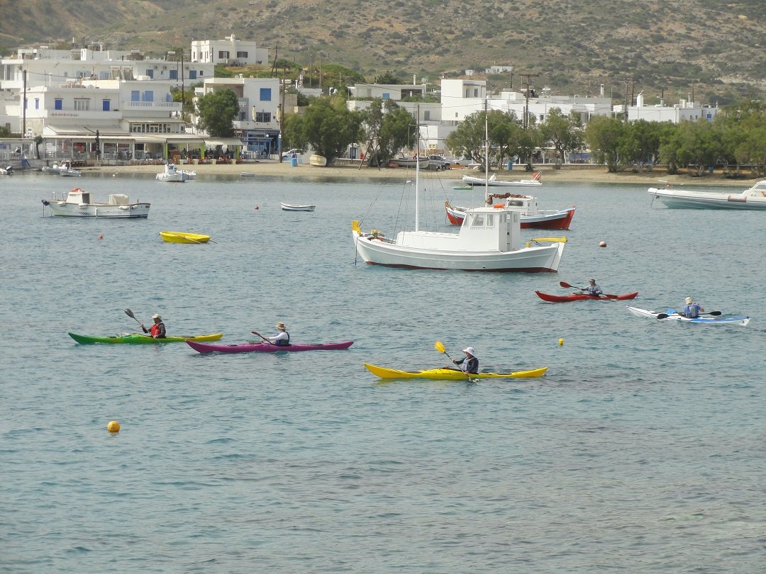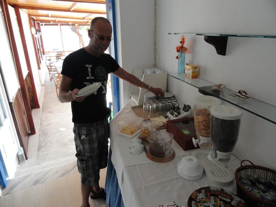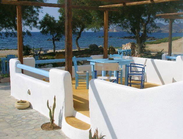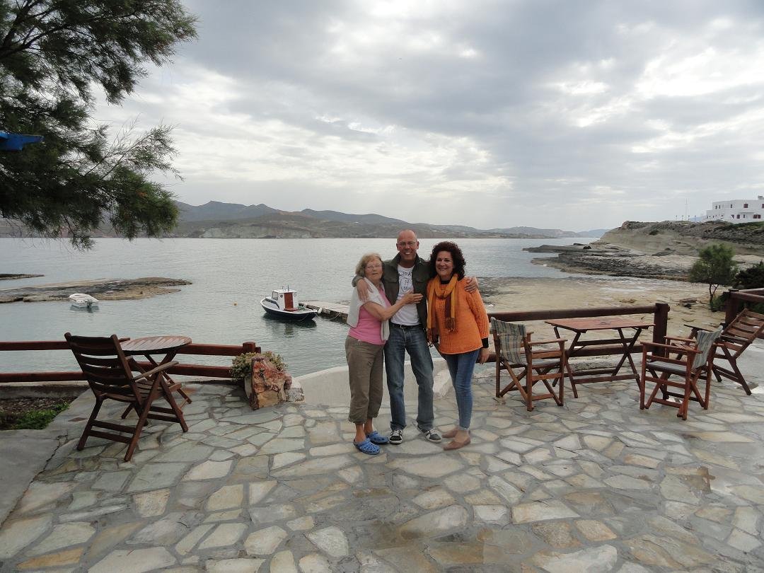 Het complex lag op een heerlijk rustig plekje waar zo goed als geen verkeer langskwam en het dorpje op zich vonden wij best gezellig. In de morgen werd je wakker met de musjes en het geluid van de golven van de zee. Het leek een beetje op Aliki op het eiland Paros, een ander dorp waar wij graag komen. In ieder geval vatbaar voor herhaling, want we willen zeker nog een keer terug naar Milos. Het viel absoluut niet tegen! Mooie natuur, mooie stranden, lekker eten en hele aardige mensen. De mensen die bij Soultana werkten waren daar geen uitzondering op. Mevrouw Soultana is een schat en verder was iedereen ook erg aardig. Bij het hotel aan de overkant kun je ontbijten, een aanrader: even de straat oversteken en je zit aan de zee met je kop koffie en je broodje al klaar. Er is een ontbijtbuffet, erg makkelijk. Stravroula zorgt dat alles klaar staat en soms bakt ze zelf het brood.
